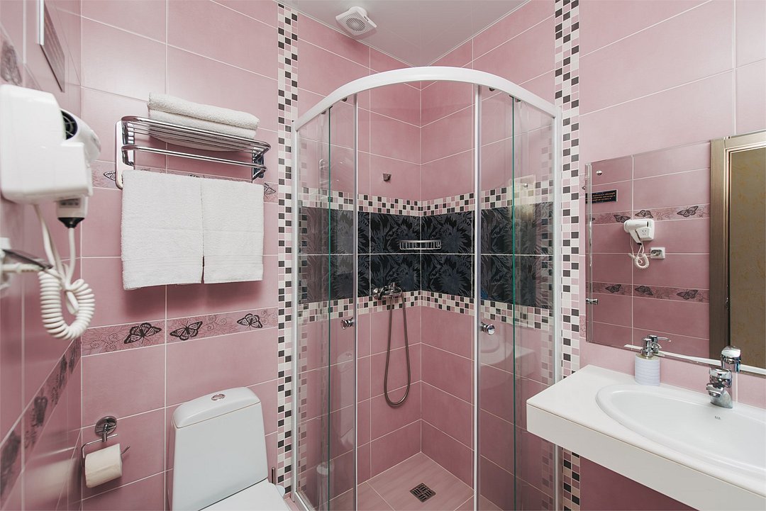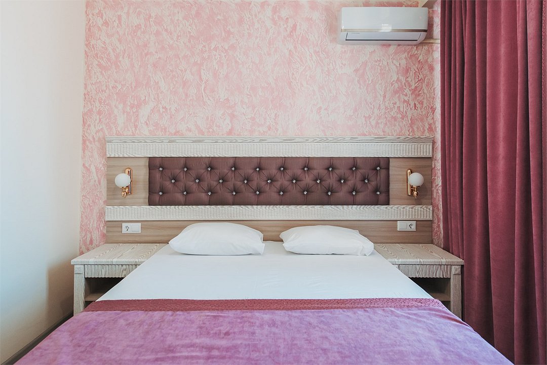 В 4-этажных корпусах на огороженной компактной территории одновременно могут остановиться 414 человека. В 200 номерах есть бесплатный WI-FI и кондиционер, холодильник и телевизор. Для проживания предлагается номерной фонд четырех уровней: от эконом-класса и комфорта до студии и люкса. В нижней категории санитарные удобства – за пределами номера, на этаже. В остальных случаях в распоряжении гостей – индивидуальные санузлы с душем, туалетными принадлежностями, халатом и тапочками.