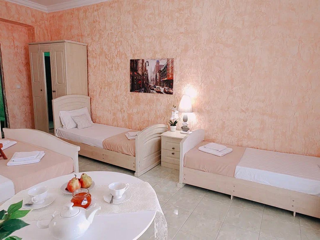 Светлый, уютный однокомнатный номер с балконом и собственной ванной комнатой. Номер оборудован: кровать размера queen-size, две односпальные кровати, мини-холодильник, телевизор, wi-fi, шкаф и туалетный столик. Балкончик. Комфортную температуру обеспечивает сплит система кондиционирования.В номере