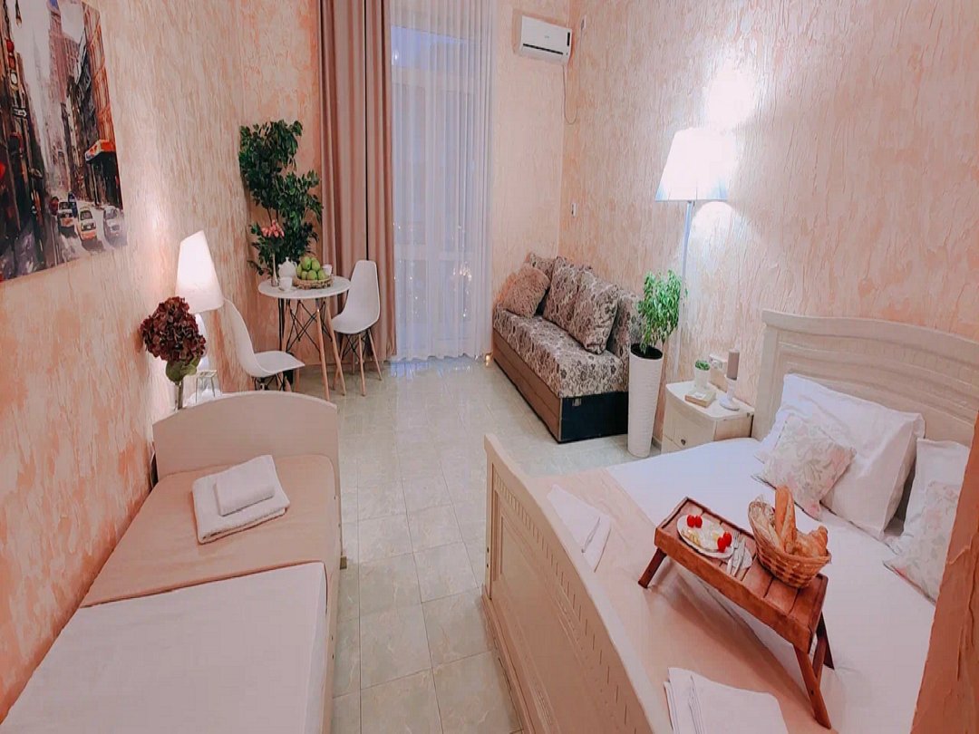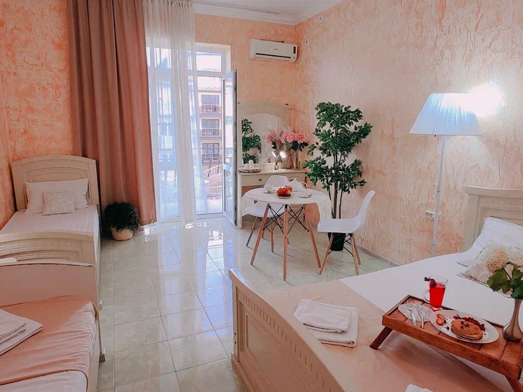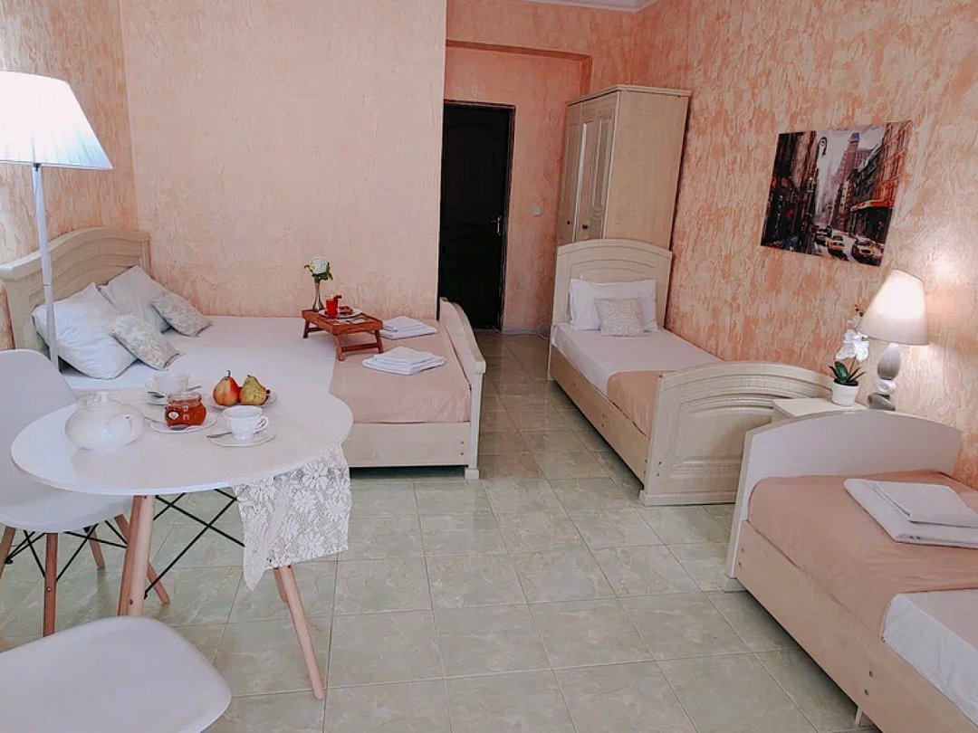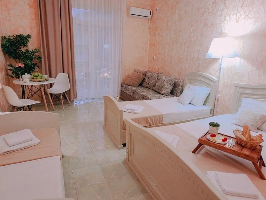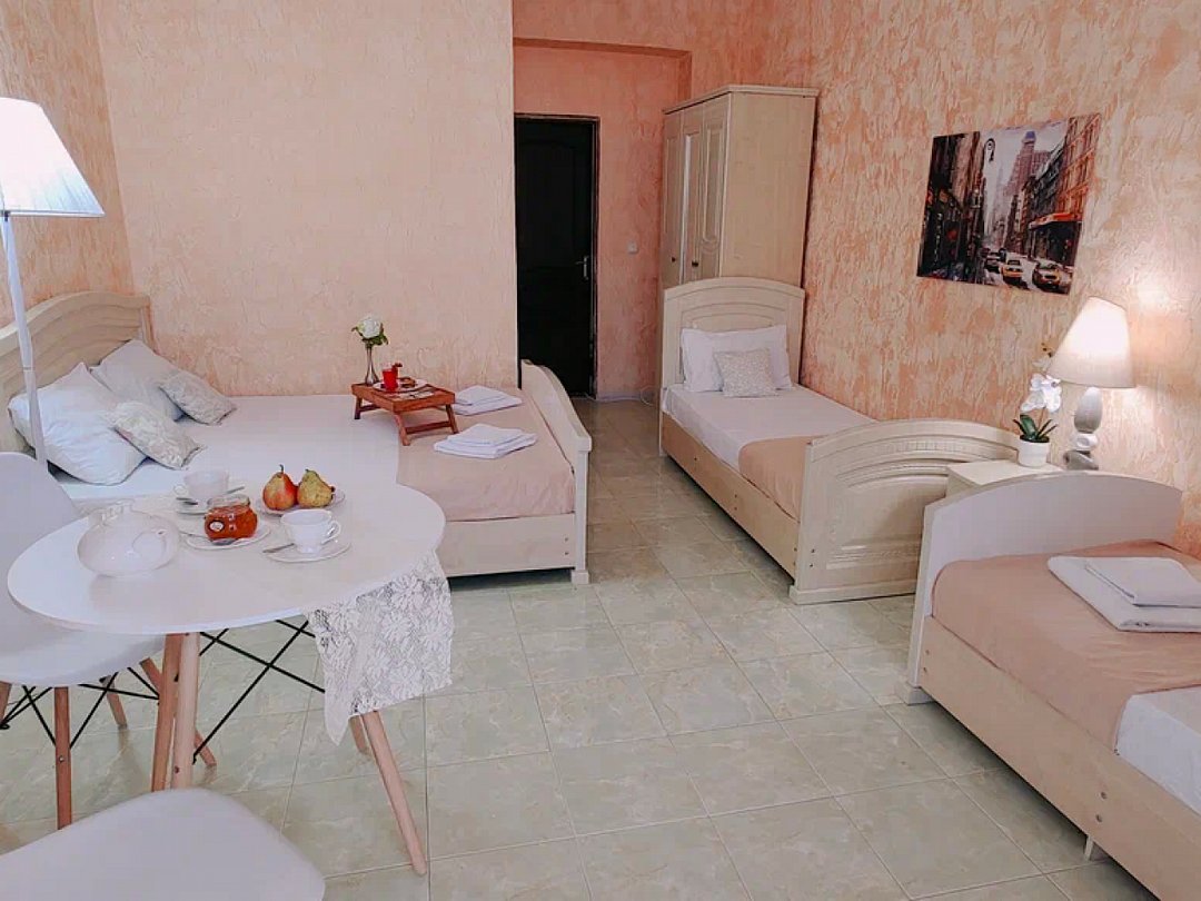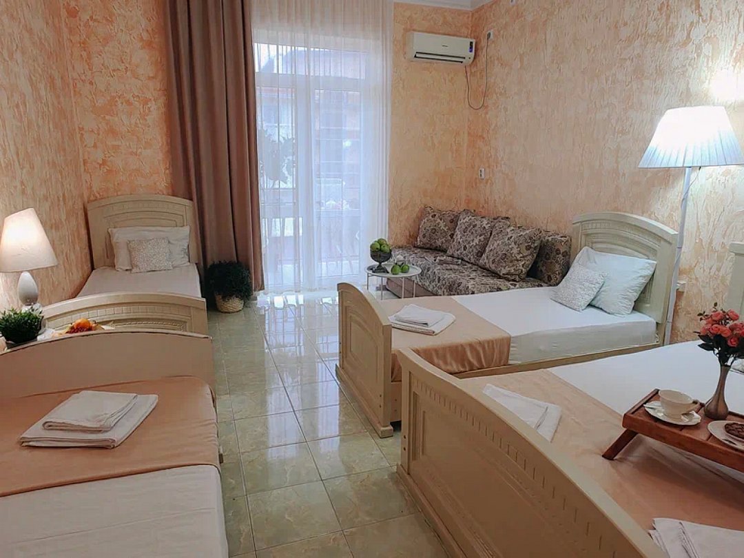 Однокомнатный номер с возможностью комфортного размещения до 5 человек. Номер оборудован: кровать размера queen-size, три односпальные кровати, кондиционер, мини-холодильник, телевизор, wi-fi, шкаф и туалетный столик. Французский балкончик.В номере