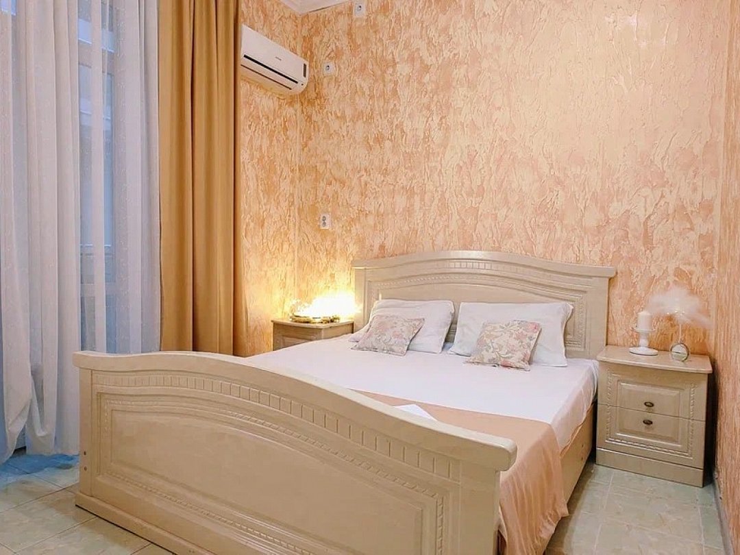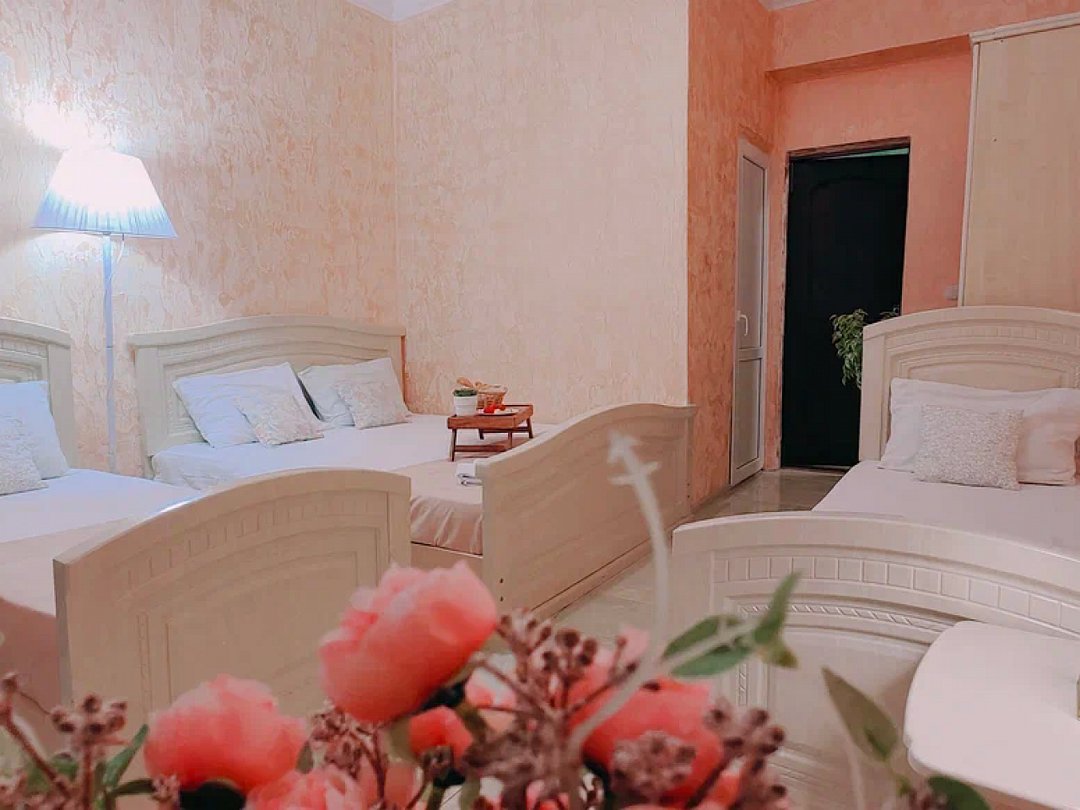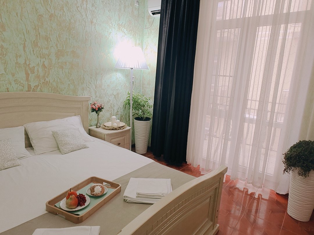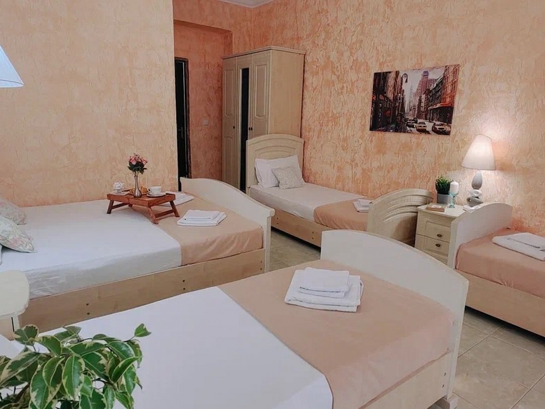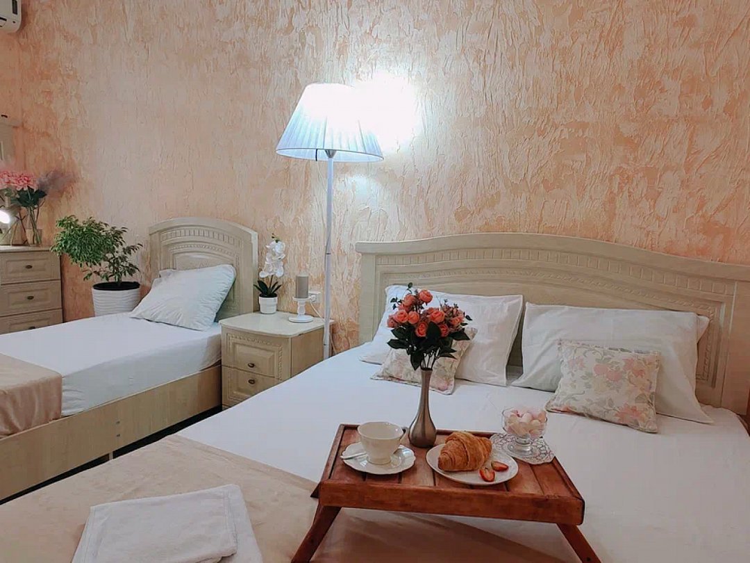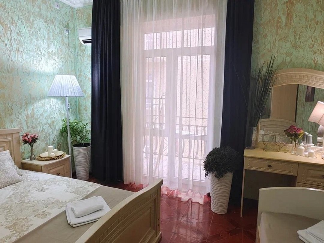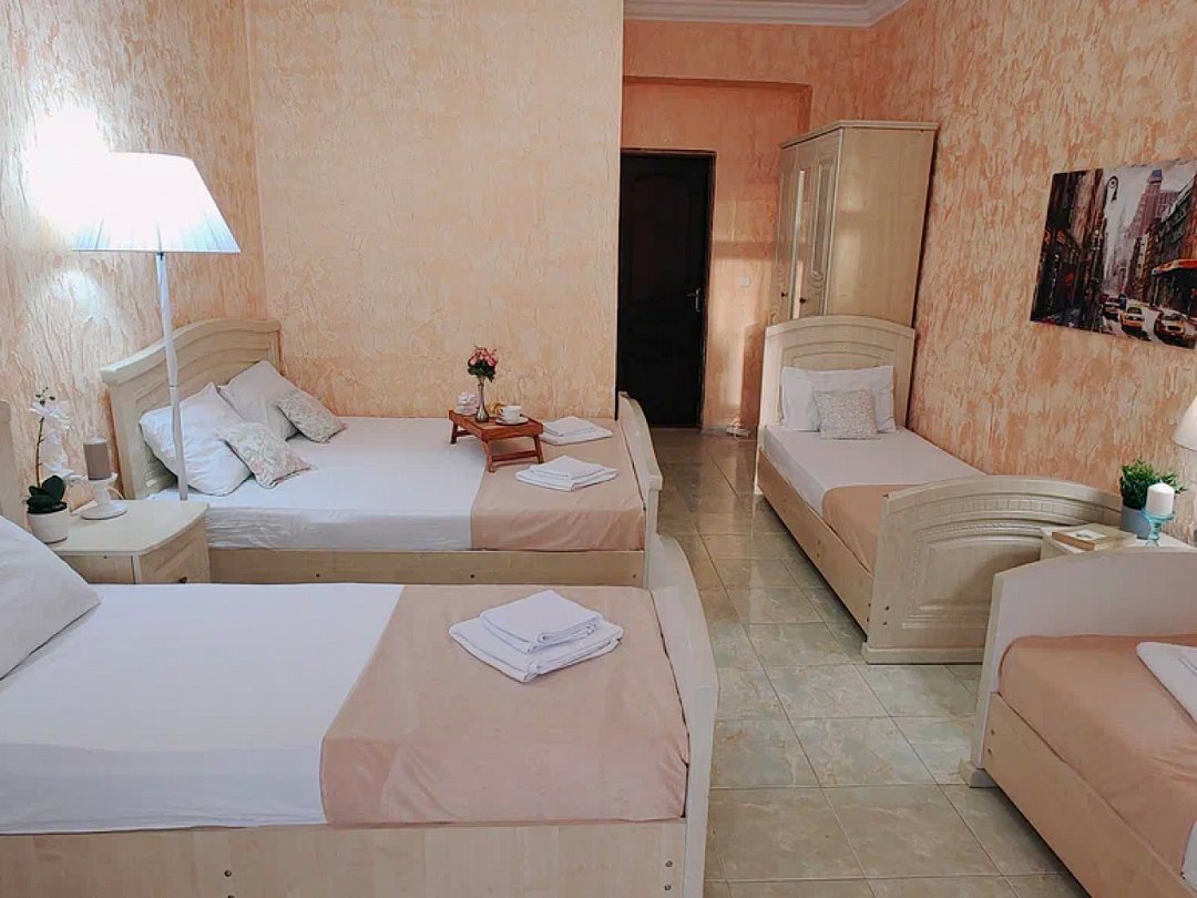 Однокомнатный номер с возможностью комфортного размещения до 5 человек. Номер оборудован: кровать размера queen-size, три односпальные кровати, кондиционер, мини-холодильник, телевизор, wi-fi, шкаф и туалетный столик. Французский балкончик.В номере