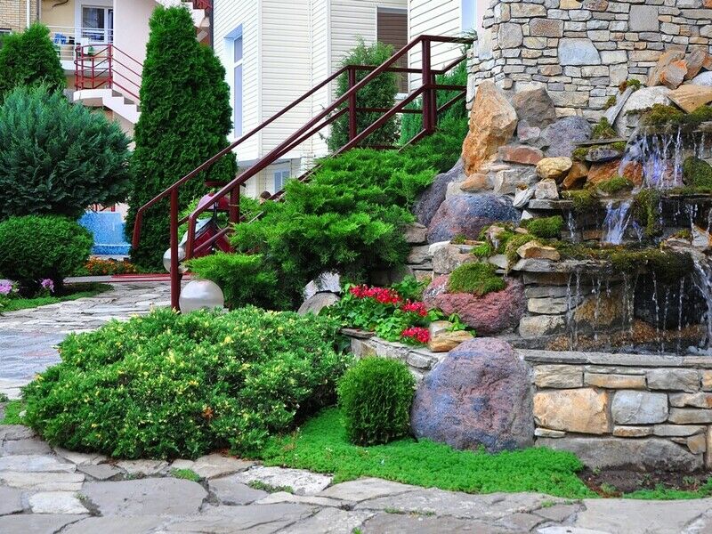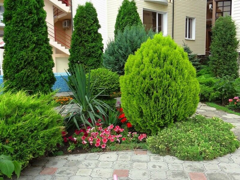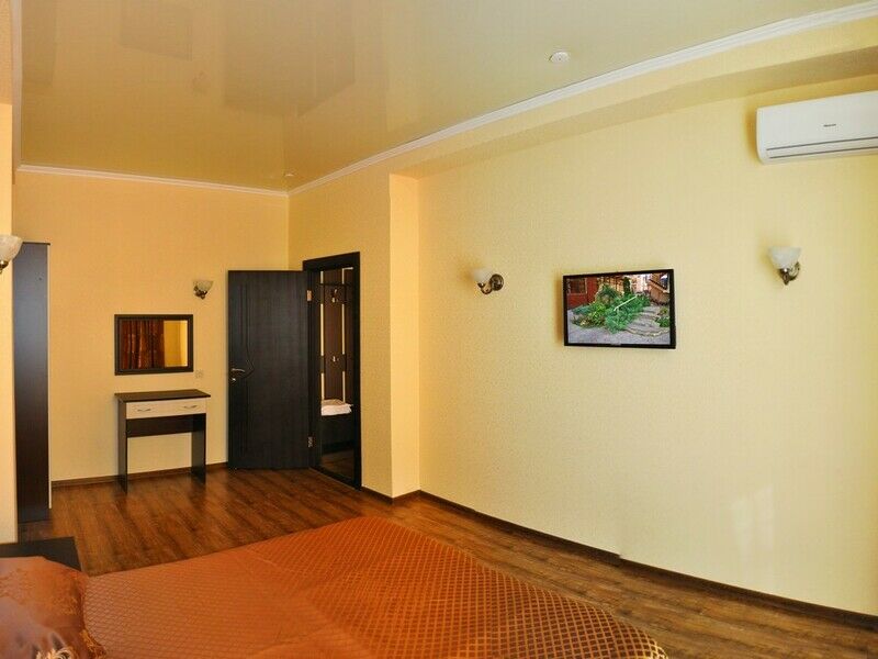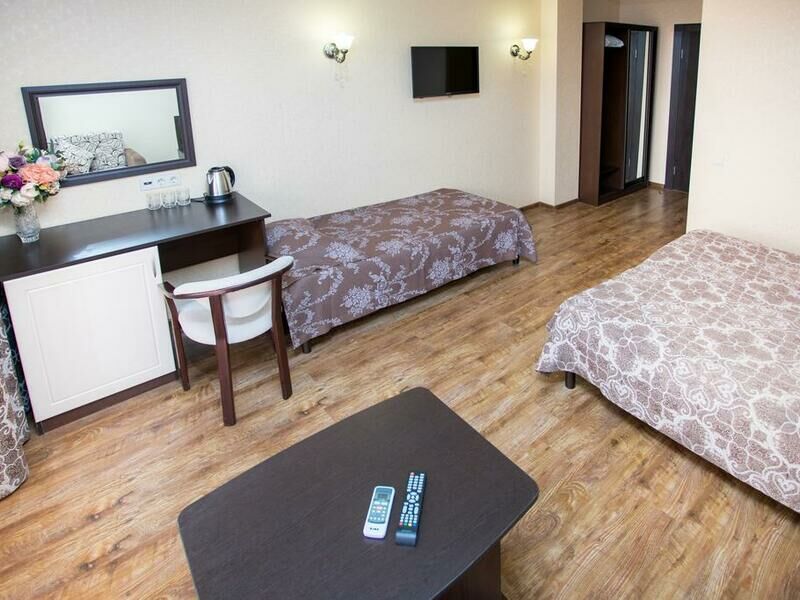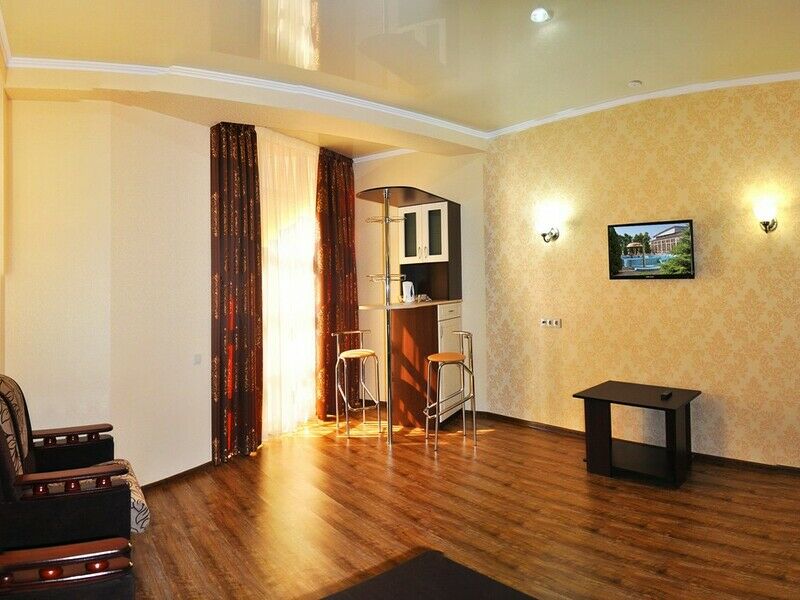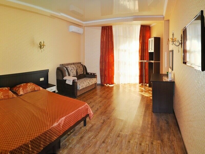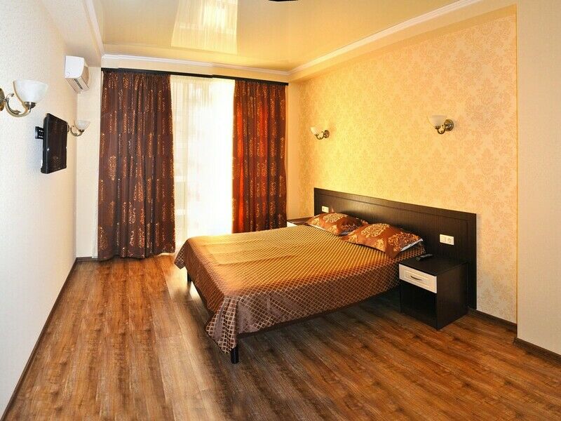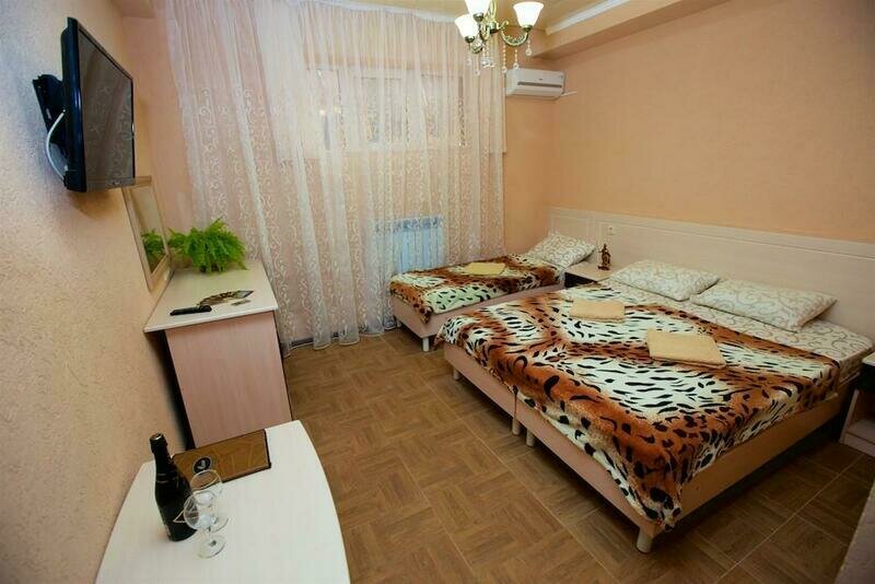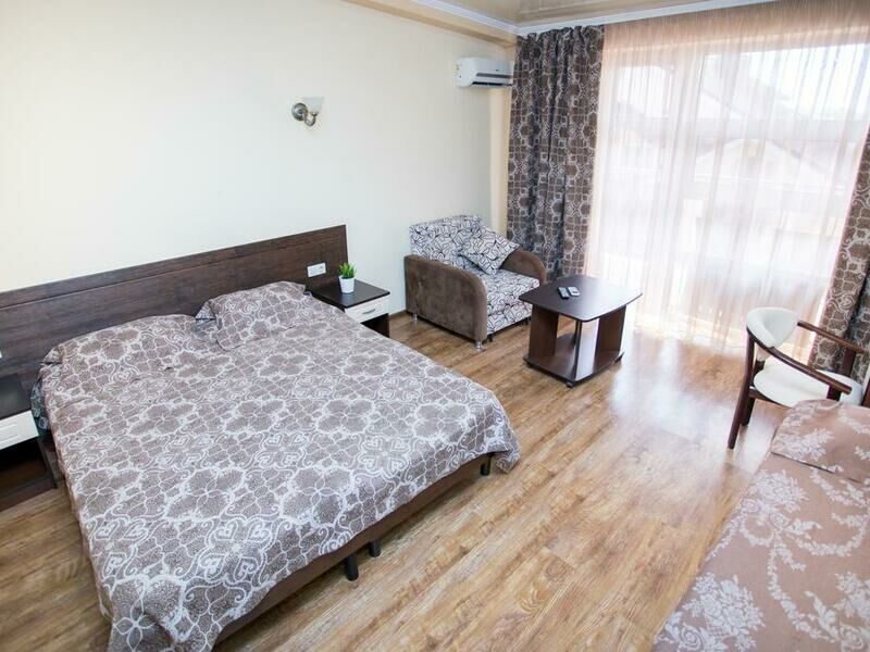 Охраняемая территория гостевого дома благоустроена зелеными насаждениями и цветниками, альпийской горкой с фонтанами, зонами отдыха и беседками. Два 5-этажных корпуса без лифта вмещают 32 просторных номера, способных одновременно предоставить места для 64 постояльцев. Номера разных категорий от «люкса» до «стандарта» имеют автономные санузлы с душем и феном, обеспечены необходимыми бытовыми приборами: сплит-системой, холодильником, телевизором, другими удобствами. В большинстве номеров имеются меблированные балконы с сушилками. Доступ в Wi-Fi возможен на территории.