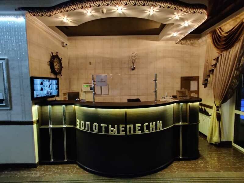 "Золотые пески" - великолепный курортный отель. Построен он был в 2014 году. Это здание, которое состоит из пяти этажей. Оно оборудовано лифтом. Холлы здесь очень просторные. Имеются общественные смотровые балконы, откуда открываются действительно великолепные виды.