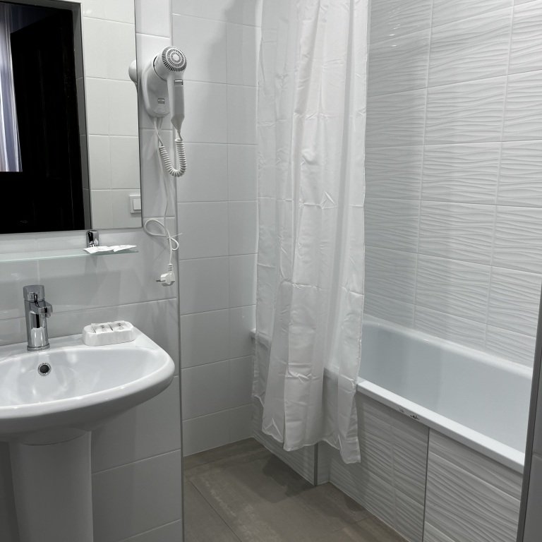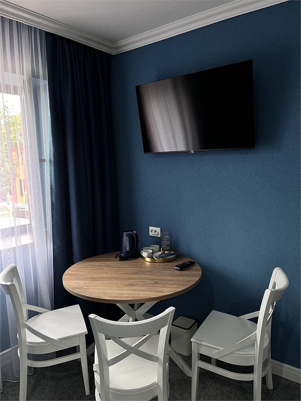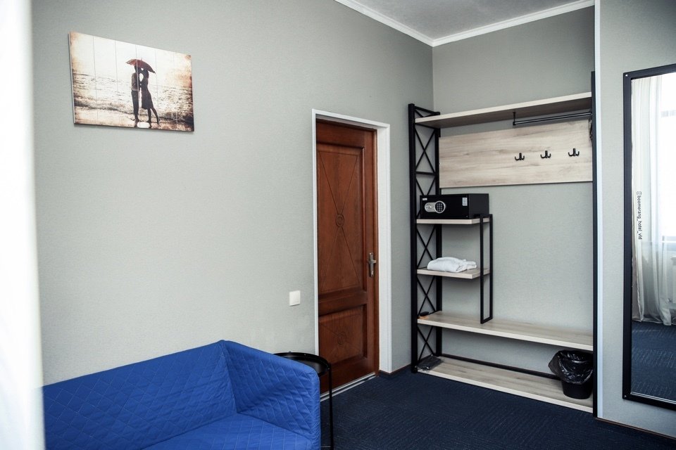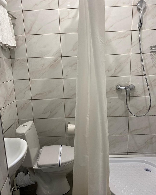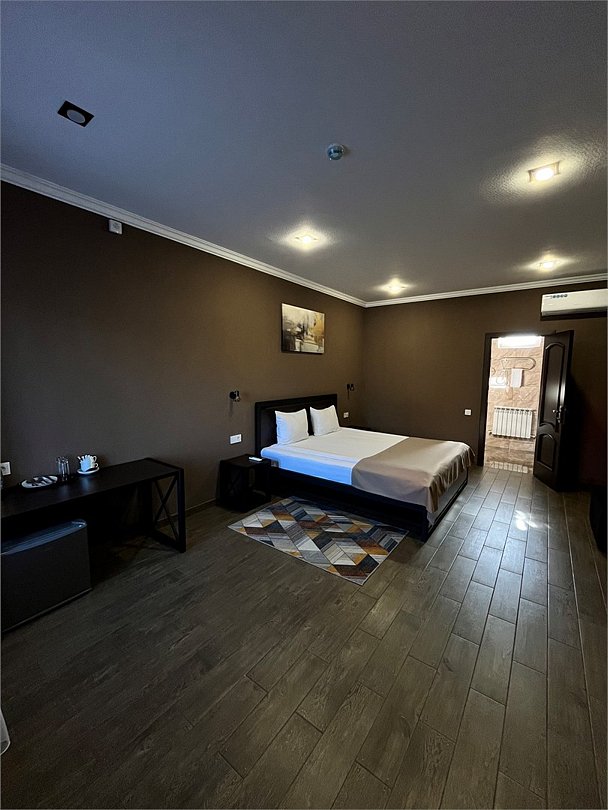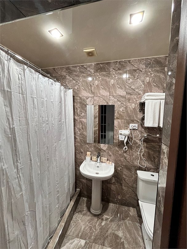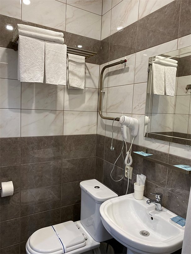 Путешествие с семьейХорошее соотношение цена-качествоОтель расположен в районе частного сектора, но недалеко от центра, тихо, спокойно, огороженная территория. В номерах чисто, есть чайник, холодильник, бутылка воды 1,5 л, чай, вот кофе нет. Разовые тапочки. В ванной комнате набор с зубными щетками и пастой, мыло, шампунь и гель для душа в разовых пакетиках. Не очень удобная душевая кабина, полуоткрыта и вода заливает пол в ванной во время мытья. Номера чистые, постель удобная. Девушки на рецепшне приятные, внимательные, быстро заселили, «устроили» наш чемодан после выселения. Можно заказать завтрак на месте. Так как мы останавливались на одну ночь по дороге в Грузию, и через неделю снова на одну ночь, то завтрак заказали во вторую остановку - столовая в отдельном корпусе, надо пройти по улице на территории гостиницы, вот тут мне не очень понравилось, прохладно в октябре в помещении, смурная, уставшая женщина вынесла, заказанные нами с вечера, блюда и ушла заниматься своим делами, от которых как нам показалось мы ее оторвали. На небольшом общем столе отдельно лежали хлеб, сыр, джем, что-то ещё, что входило в стоимость завтрака, но этого было так мало, что даже неудобно было забирать последние кусочки))) а пополнится это или нет, спрашивать не очень хотелось. Ну может просто день у человека не задался или самочувствие не очень было, мы же только один раз завтракали, но если в столовой всегда так встречают, это не очень приятно.