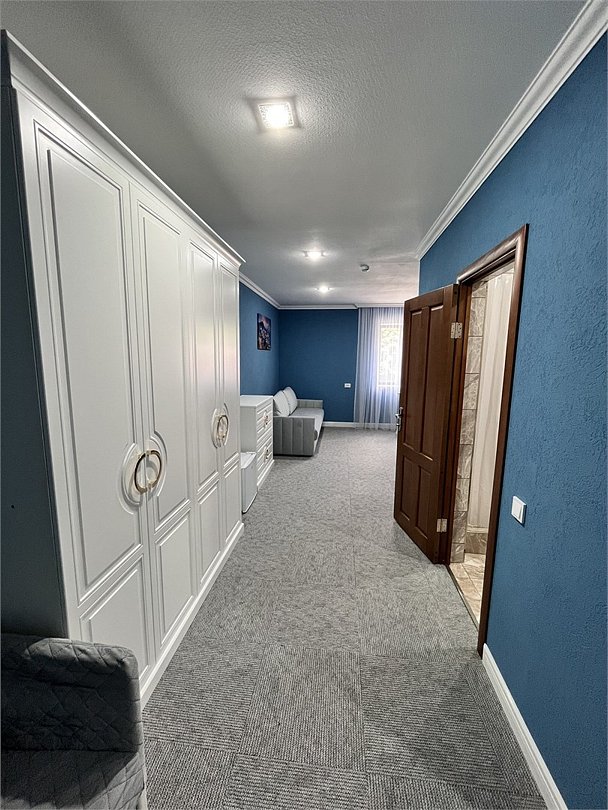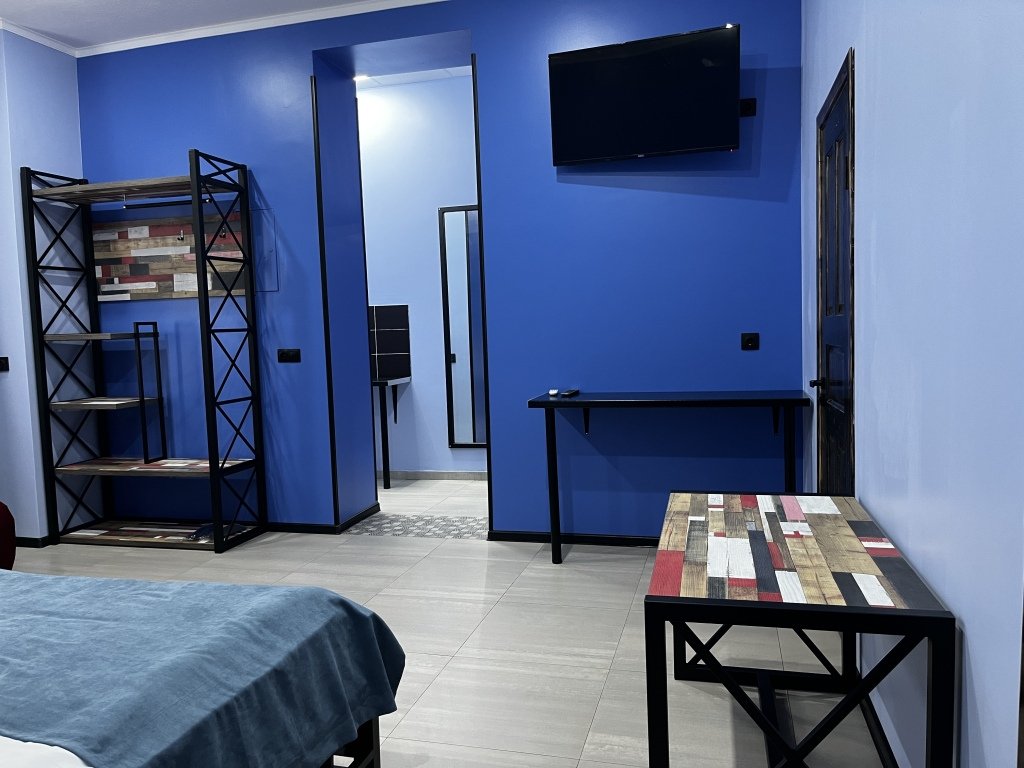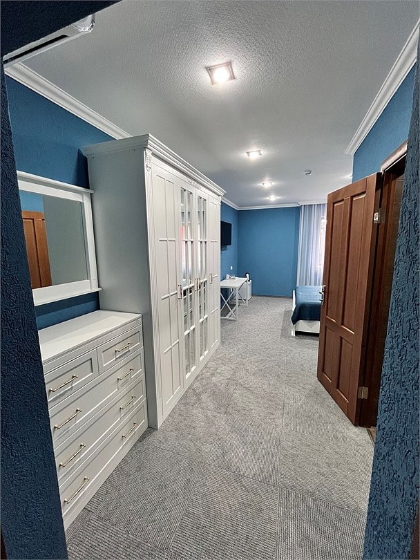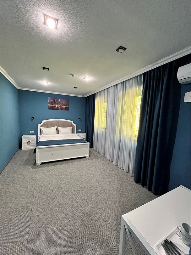 телевизор, Wi-Fi, кондиционер, светильник, фен, банные принадлежности, тапочки, гигиенические средства, двуспальная кровать, шкаф для одежды, вешалки, журнальный столик, зеркало, комод, пуфики, чайный набор, набор посуды, чайник, унитаз, раковина, питьевая вода, ковровое покрытие, отопление, душ, вид во двор, высокие потолки, стаканы, столовые приборы, туалет, сплит-система, мини-холодильник, номер для некурящих, уборка номера, бутилированная вода, мыло, без питомцевВ номере