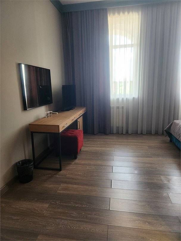 телевизор, Wi-Fi, кондиционер, душевая кабина, халаты, тапочки, гигиенические средства, двуспальная кровать, зеркало, мебельный гарнитур, унитаз, вид на город, кулер на этаже, вид во двор, стул, мини-холодильник, угловой диван-кроватьВ гостиничном номере