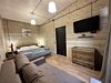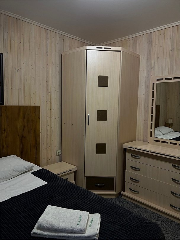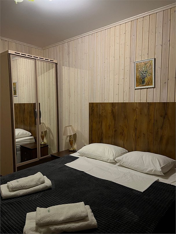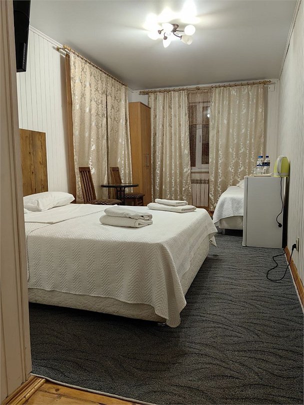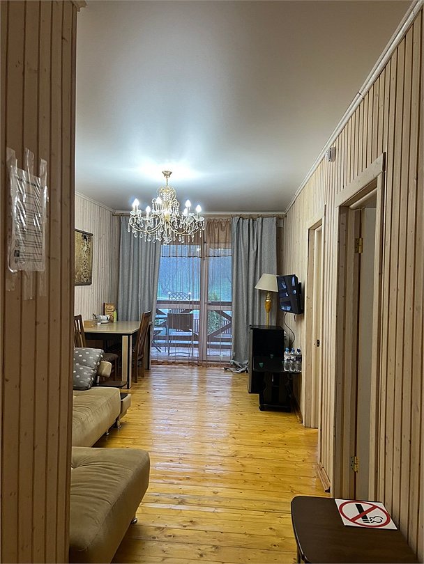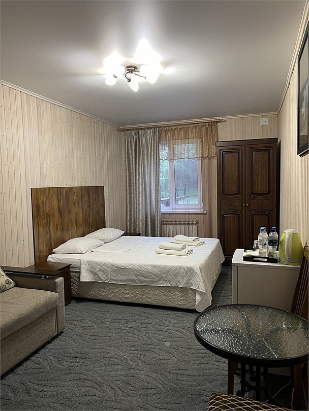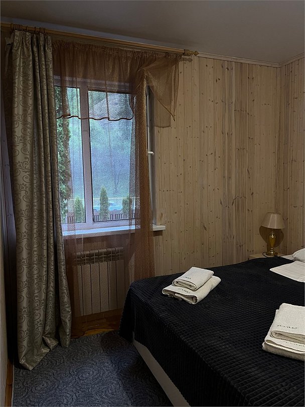 Номер ДВУХКОМНАТНЫЙ располагает двумя уютными двуспальными кроватями в отдельных спальнях, а также диваном в гостиной - для размещения взрослого или ребенка. Ванная комната с санузлом. Телевизор Смарт ТВ, бесплатный Wi-fi, холодильник, чайник, микроволновая печь, набор гигиенических принадлежностей. Прекрасный вид с террасы на горы, лес и реку. Свой балкон с мебелью. Чистота в номерах гарантирована. В дополнение - завтраки, а вкусное меню нашего ресторана никого не оставит равнодушным! Размещение с питомцами - по договоренности, оплачивается отдельной услугой.Услуги и удобства