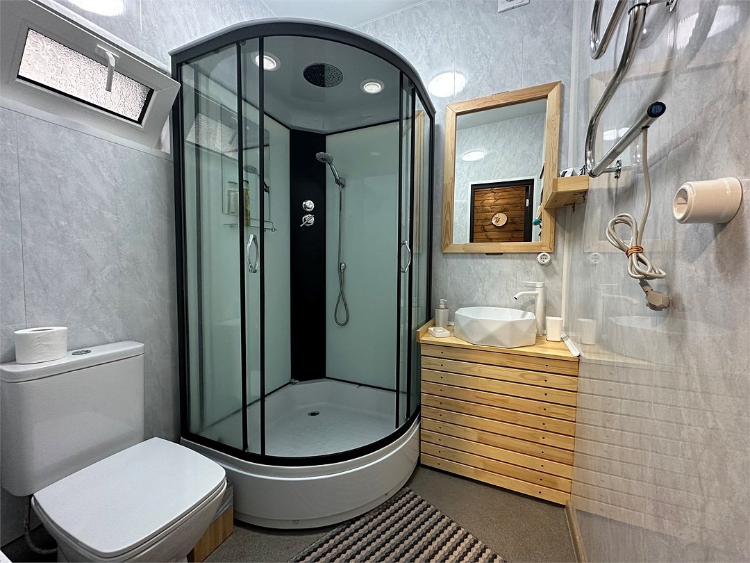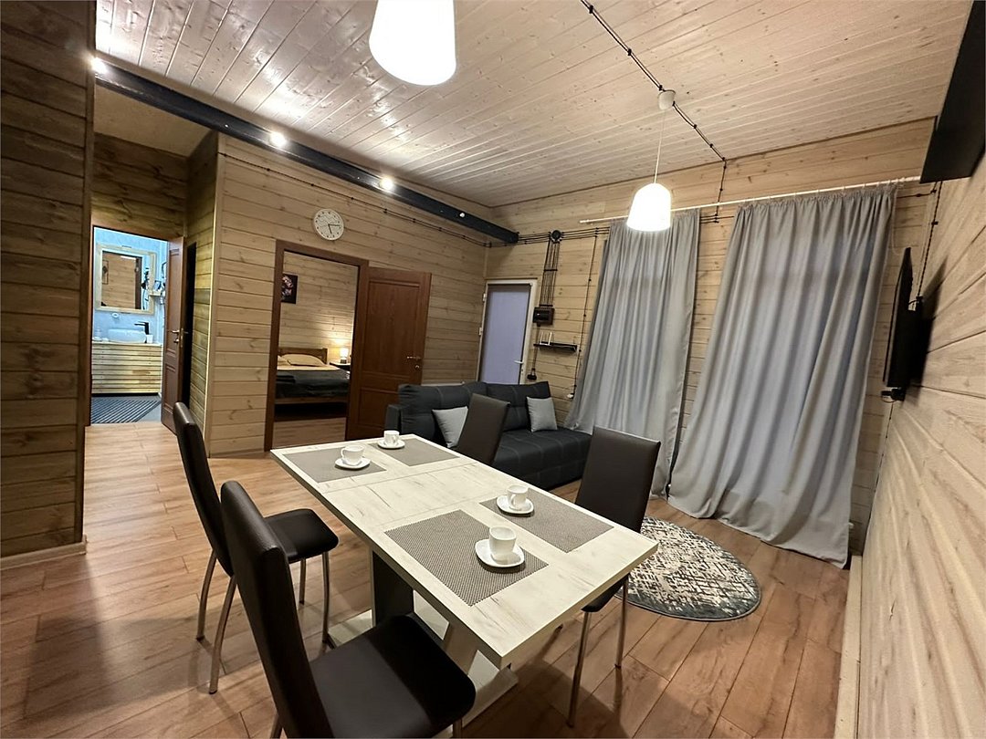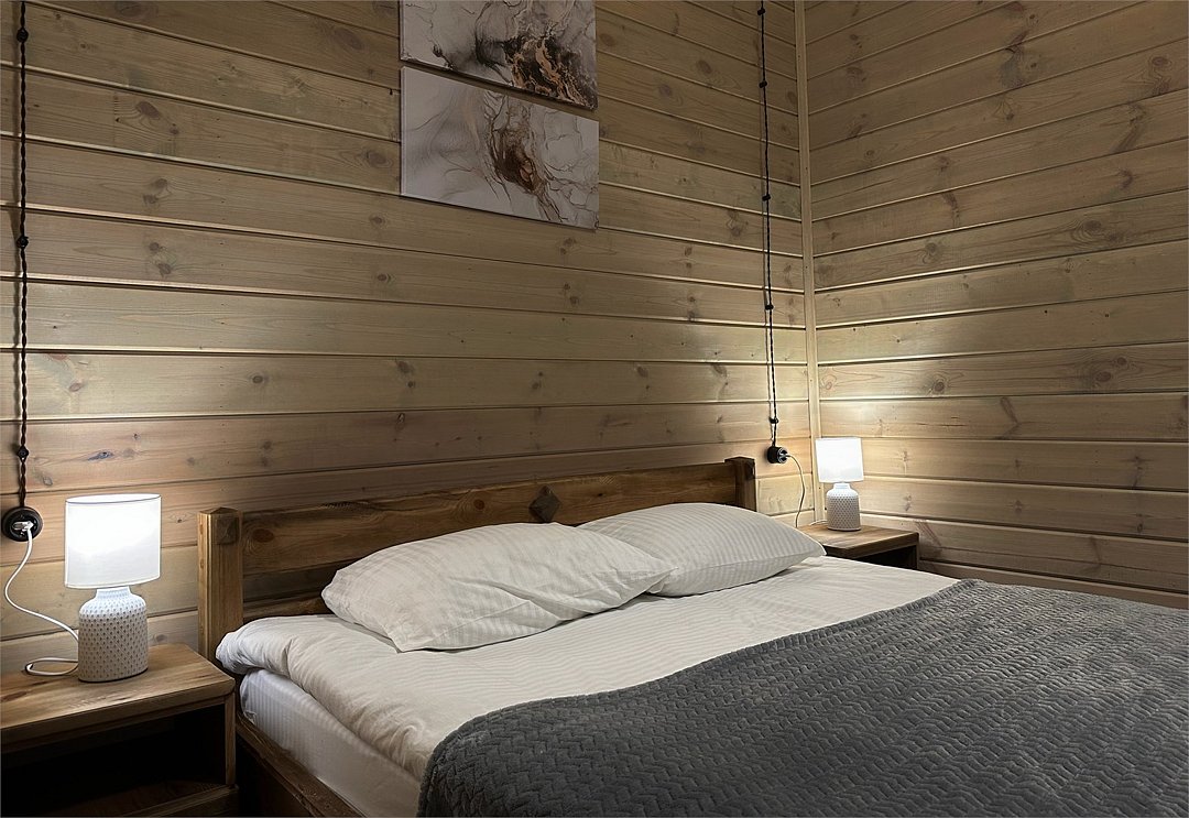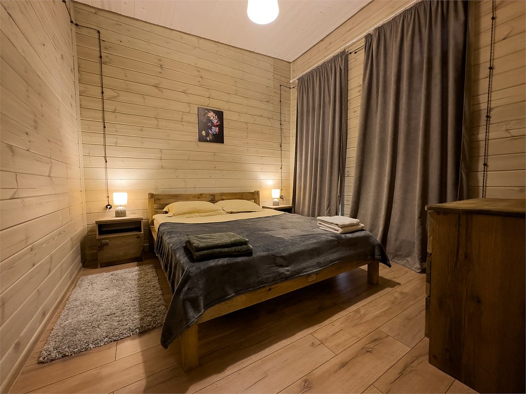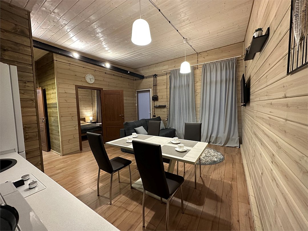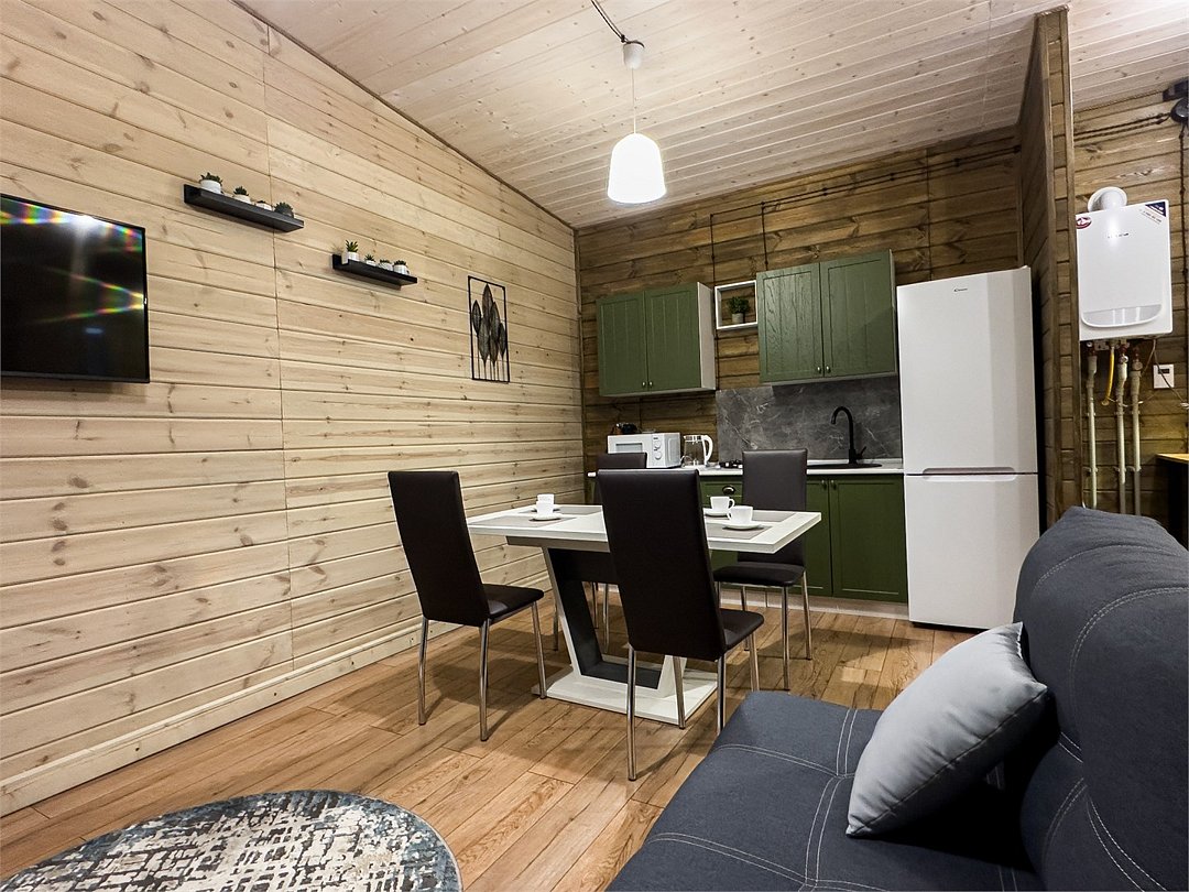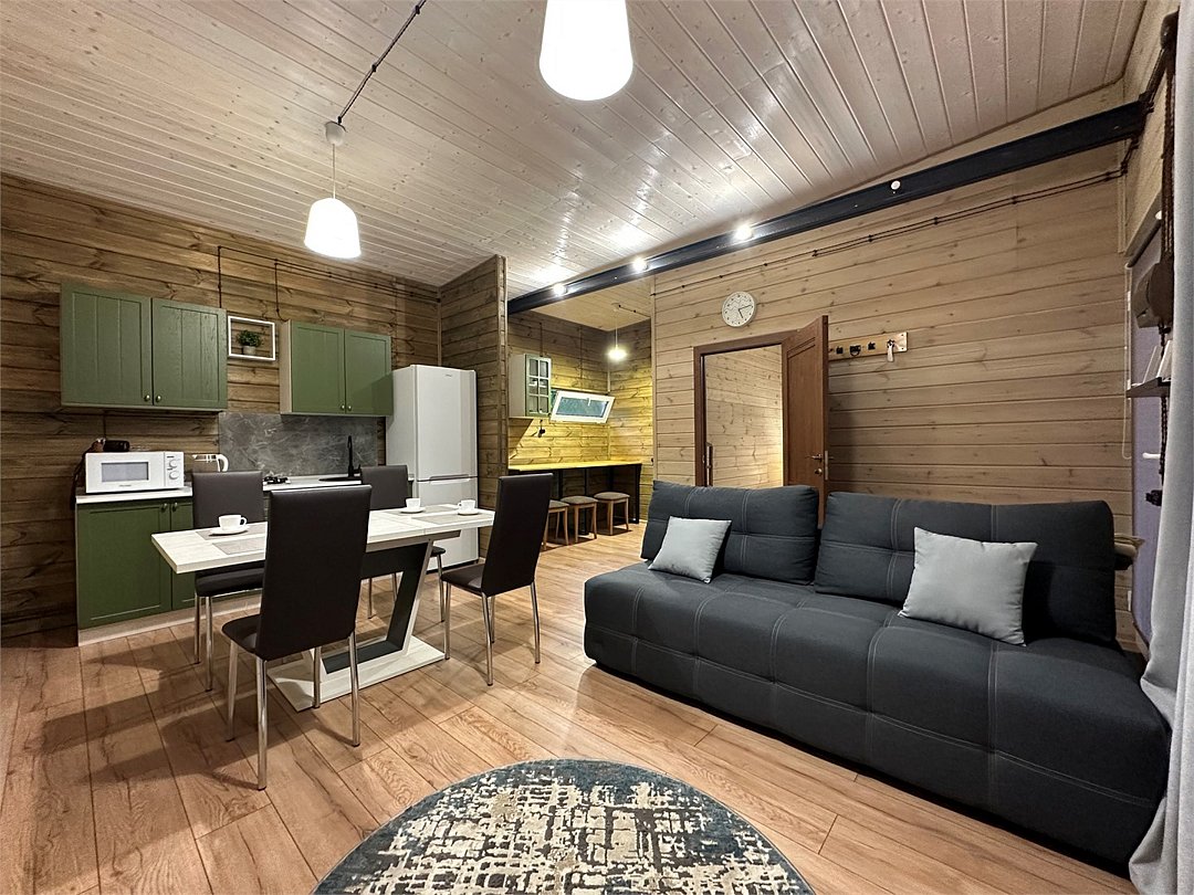 Коттедж-студия. Спальня с двуспальной кроватью, полноценная кухня с гостиной. Душевая комната с кабиной, раковиной, санузлом. Раскладной диван. Бесплатный Wi-fi. Размещение с питомцами - по договоренности, оплачивается отдельной услугой.Услуги и удобства