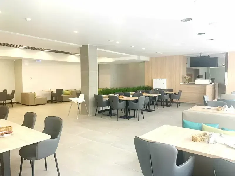 По утрам гостей ожидают завтраки по системе «шведский стол», в здании отеля работают ресторан развлекательного центра, расположенный на 2-м этаже и круглосуточный лобби-бар на 1-м.