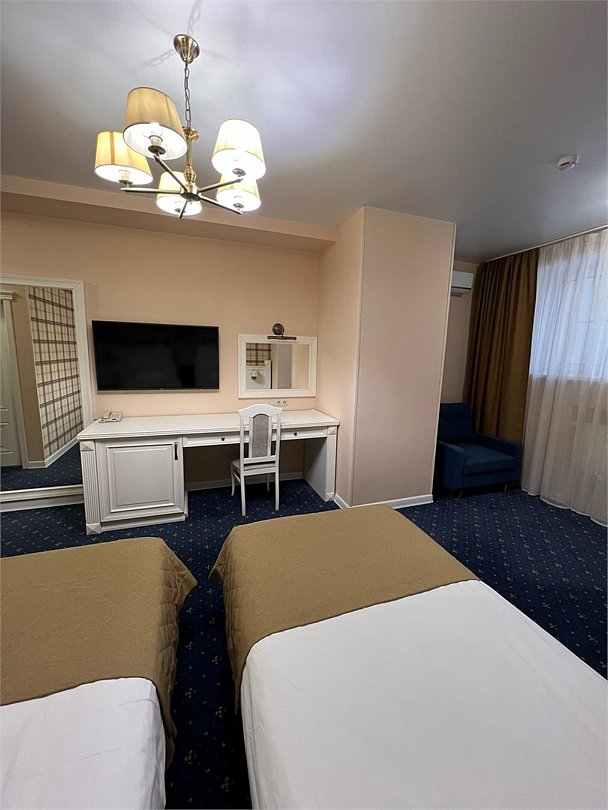 Комфортный просторный номер. Подойдет для 3 взрослых и ребенка. В номере двуспальная кровать (или 2 раздельные) и кресло-кровать. Дополнительно можно поставить детскую кроватку или евро-раскладушку. В номере: холодильник, шкаф с вешалками, тапочки, стол, двуспальная кровать или 2 раздельные, кресло-кровать, прикроватные тумбы, стул, светильники, зеркало, кондиционер, окно оборудованное москитной сеткой, шторы "Blackout", телефон, телевизор, бесплатная бутилированная вода, тапочки. В ванной комнате: душевая кабина, фен, косметические принадлежности, набор банных полотенец, зеркало.Услуги и удобства