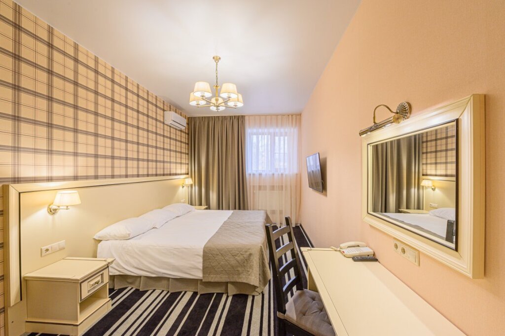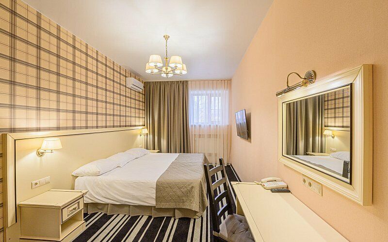 Комфортный двухместный номер с дополнительным местом В номере: холодильник, шкаф с вешалками, тапочки, стол, двуспальная кровать или 2 раздельные, раскладушка, прикроватные тумбы, стул, светильники, зеркало, кондиционер, окно оборудованное москитной сеткой, шторы "Blackout", телефон, телевизор, бесплатная бутилированная вода. В ванной комнате: душевая кабина, фен, зеркало, косметические принадлежности, набор банных полотенецУслуги и удобства