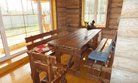 Первый этаж представляет собой столовую зону с большим столом и скамьями ручной работы, панорамным окном с выходом на терассу и ЖК телевизором.