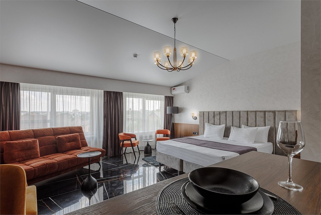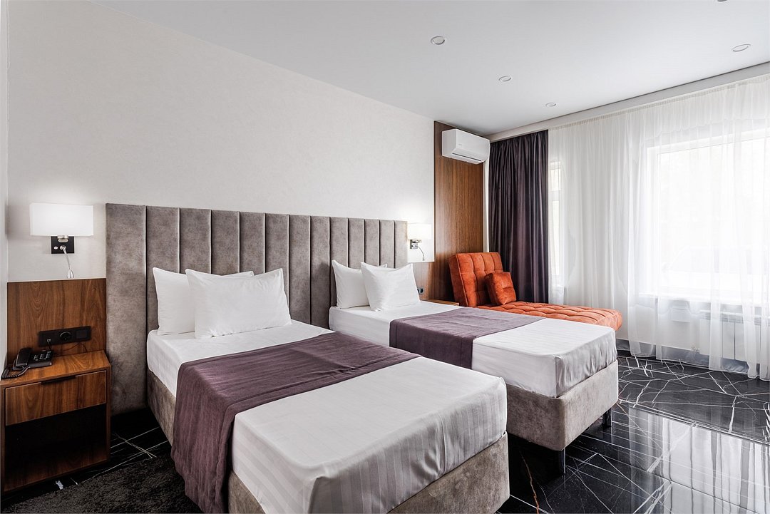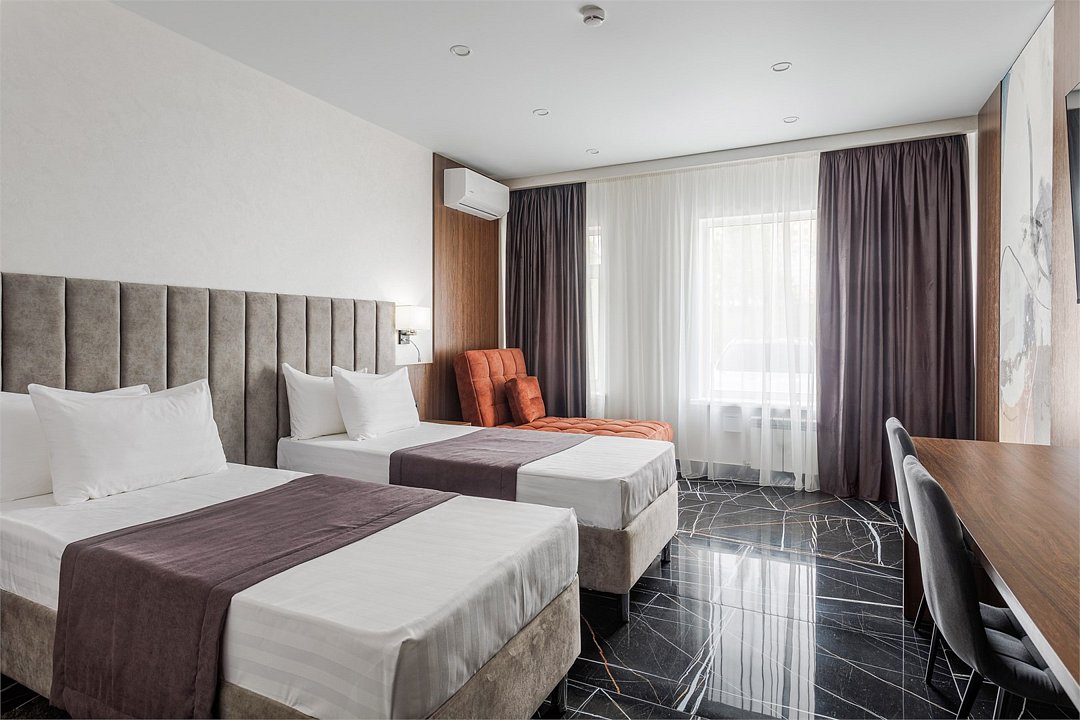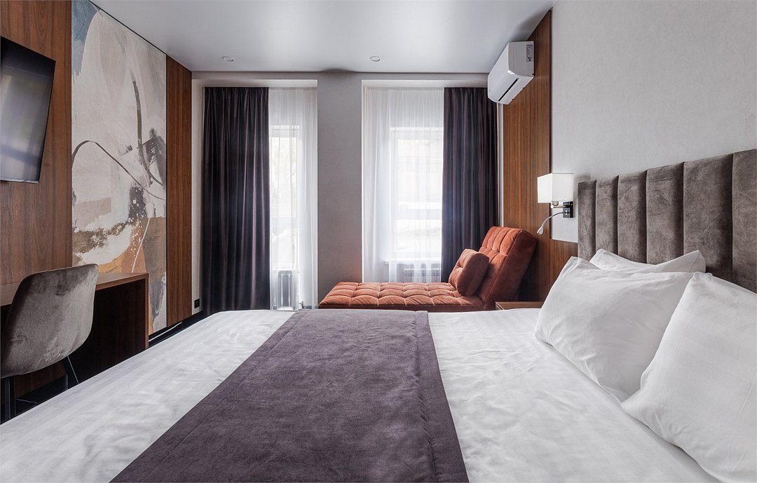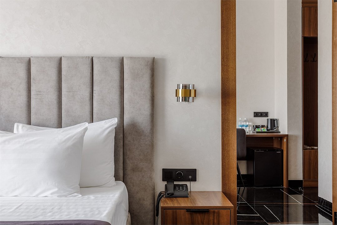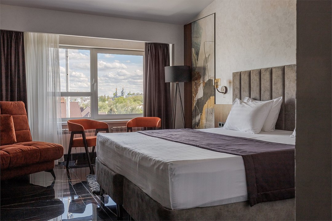 Стандартный однокомнатный номер улучшенной комфортности с двумя раздельным односпальными кроватями (90*200) или с одной двуспальной (180*200) King size и диваном 120*200 (раскладывается для 2-х человек). Площадь номера - 40 кв.м., рассчитан на 1-4 человек. Виды из окон на город с множеством храмов и монастырей. Интерьер номера выполнен в нейтральных тонах, натуральная отделка высококачественными материалами, комфортная рабочая зона, оборудован барной стойкой, продвинутая система вентиляции и поступления очищенного воздуха. К услугам гостей: электронный сейф, мини-холодильник, микроволновая печь, стол, электрический чайник и набор для приготовления чай/кофе, фен, LCD телевизор-55", бесплатный Wi-Fi, телефон, корзина для мусора, тапочки, халат, душевая (в санузле), полотенцесушитель, принадлежности для душа . Есть вариант тарифа размещения как с завтраком, так и без него.Услуги и удобства