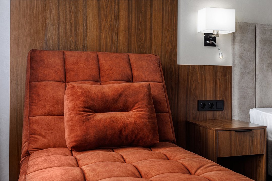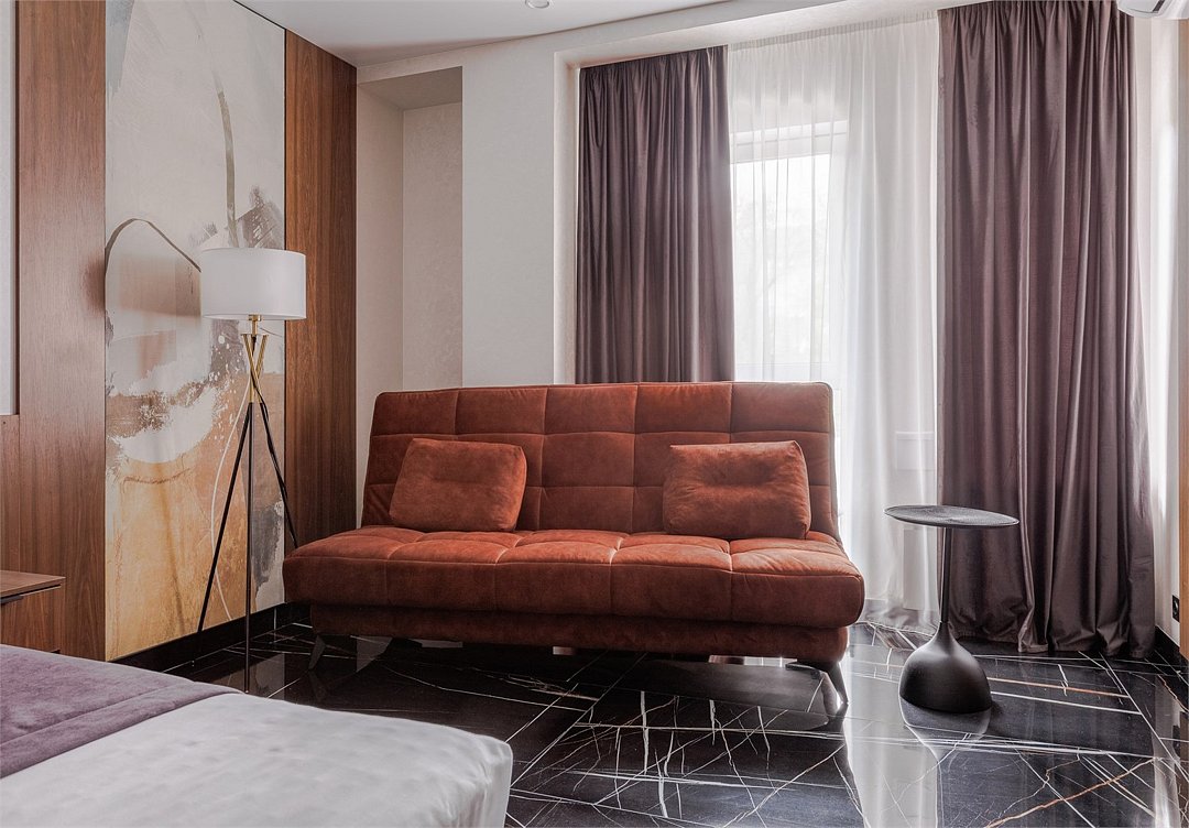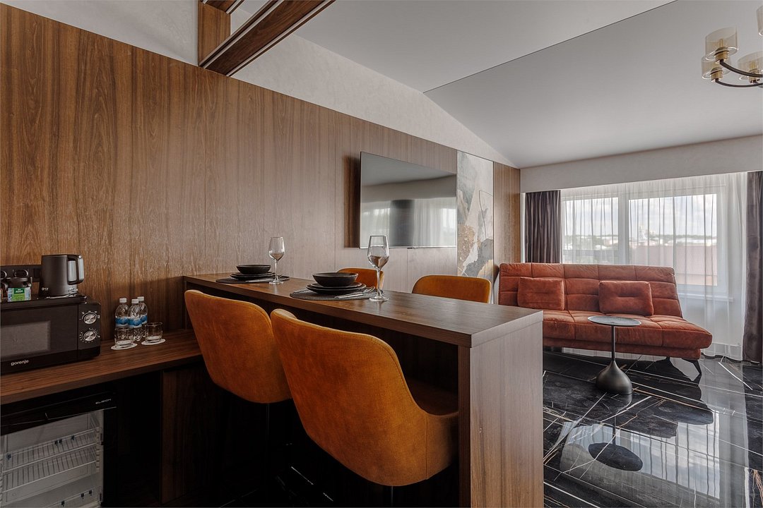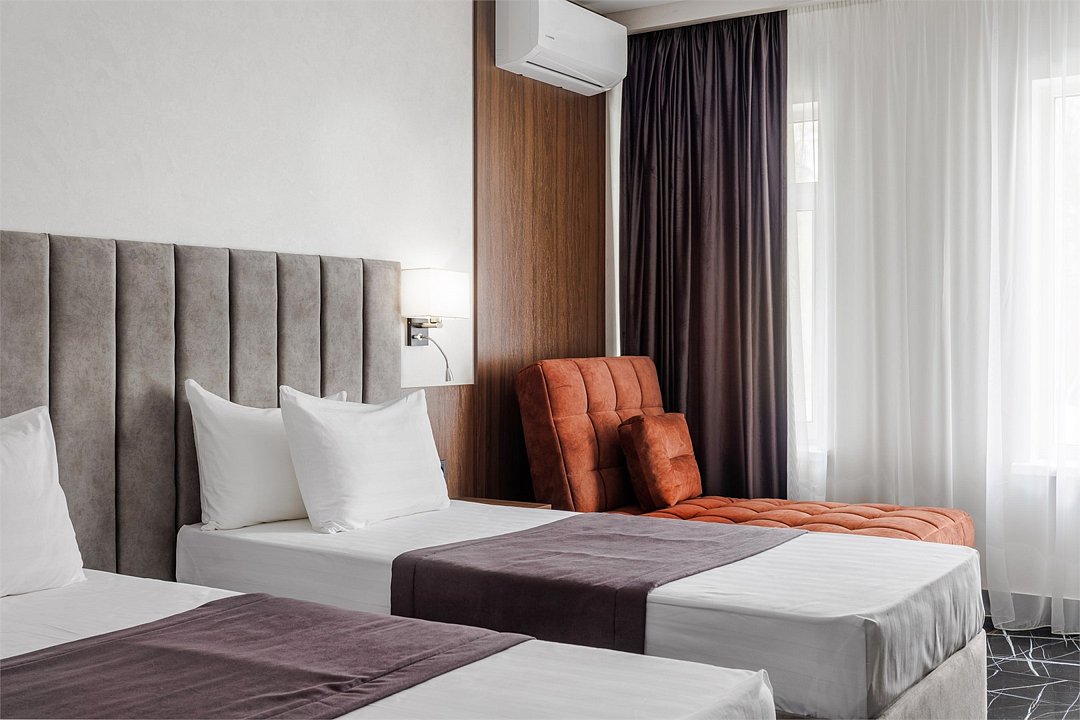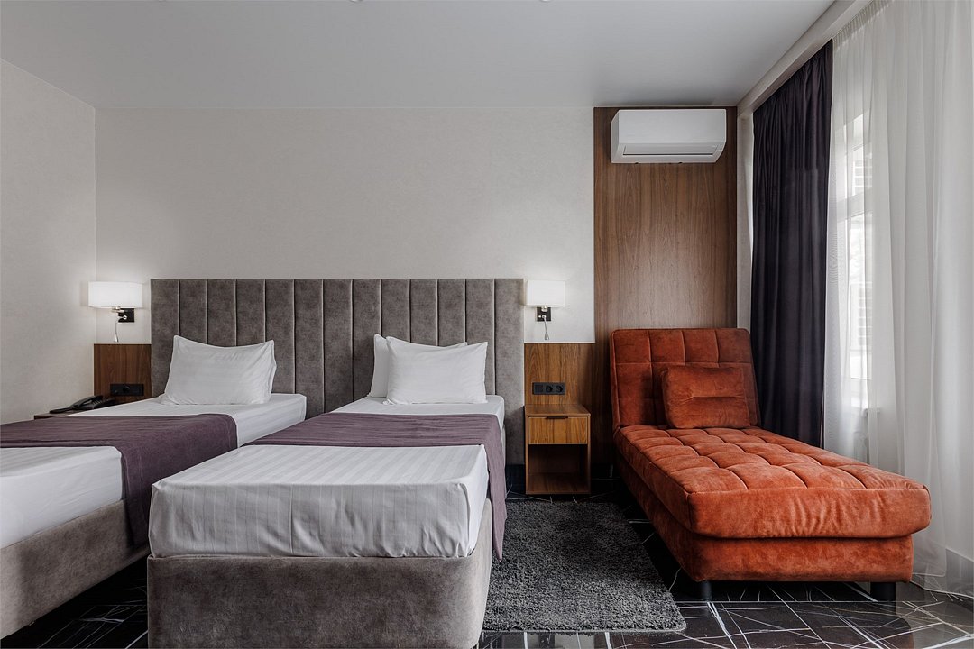 Стандартный однокомнатный номер улучшенной комфортности с двумя раздельным односпальными кроватями (90*200) или с одной двуспальной (180*200) King size и диваном 120*200 (раскладывается для 2-х человек). Площадь номера - 40 кв.м., рассчитан на 1-4 человек. Виды из окон на город с множеством храмов и монастырей. Интерьер номера выполнен в нейтральных тонах, натуральная отделка высококачественными материалами, комфортная рабочая зона, оборудован барной стойкой, продвинутая система вентиляции и поступления очищенного воздуха. К услугам гостей: электронный сейф, мини-холодильник, микроволновая печь, стол, электрический чайник и набор для приготовления чай/кофе, фен, LCD телевизор-55", бесплатный Wi-Fi, телефон, корзина для мусора, тапочки, халат, душевая (в санузле), полотенцесушитель, принадлежности для душа . Есть вариант тарифа размещения как с завтраком, так и без него.Услуги и удобства