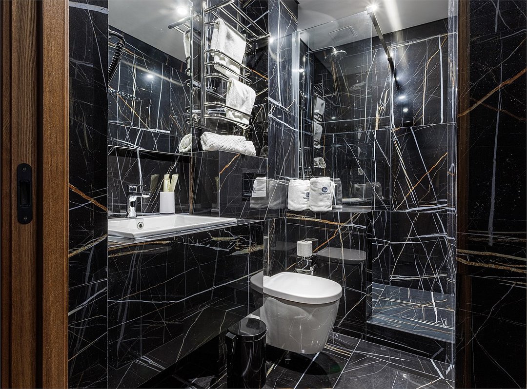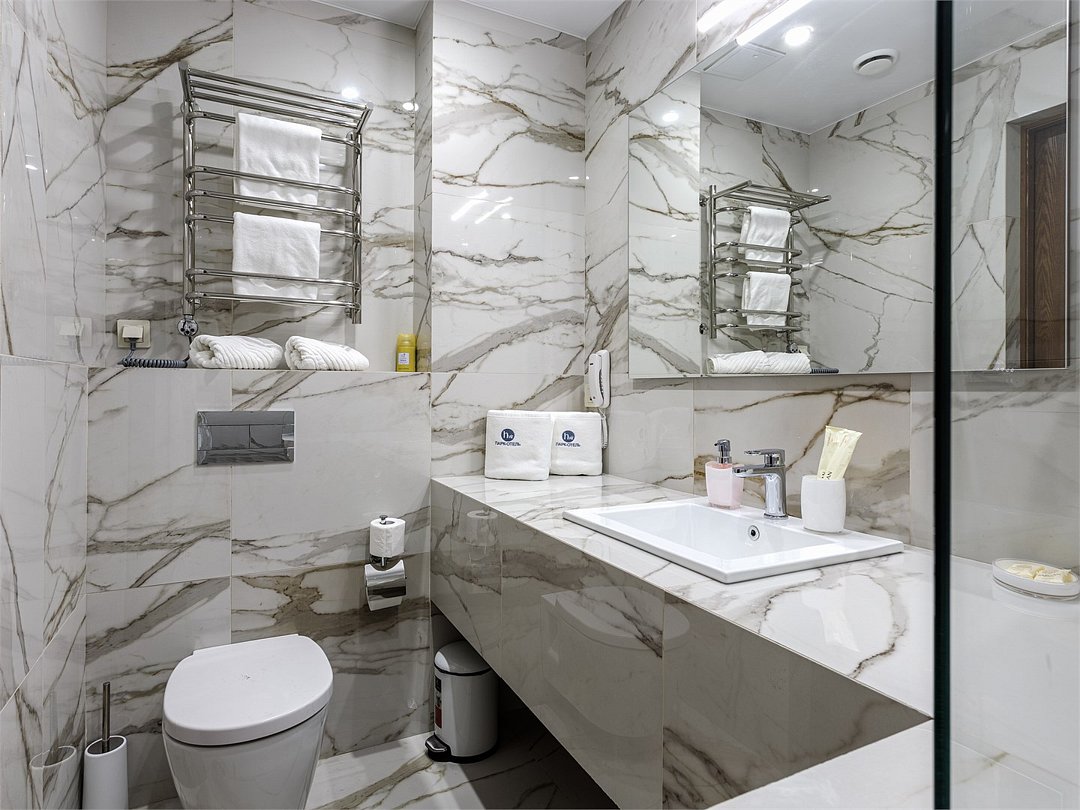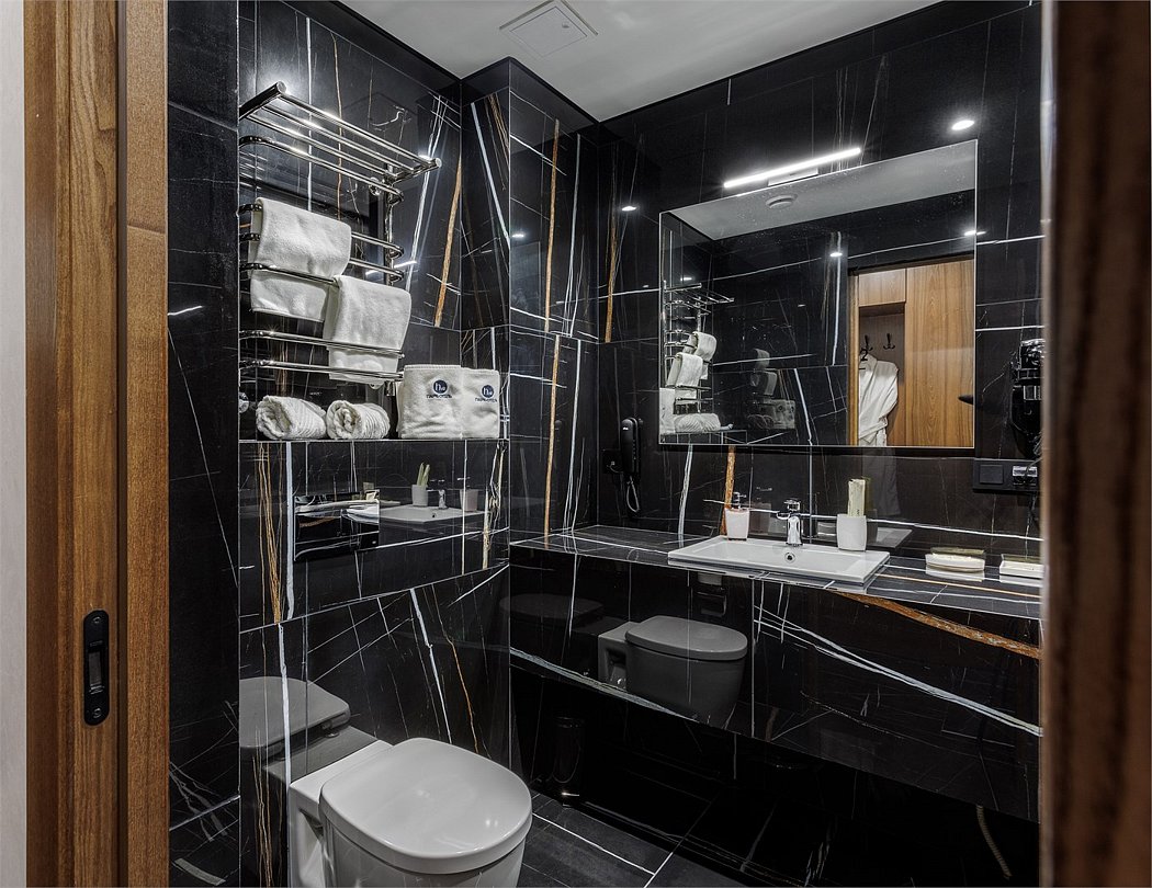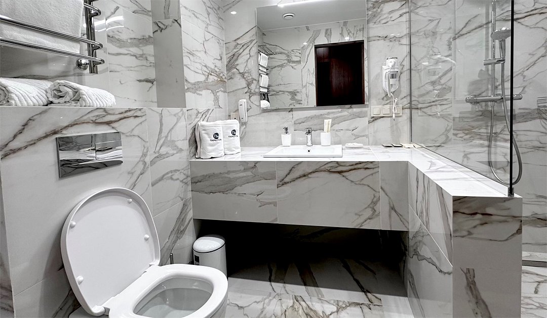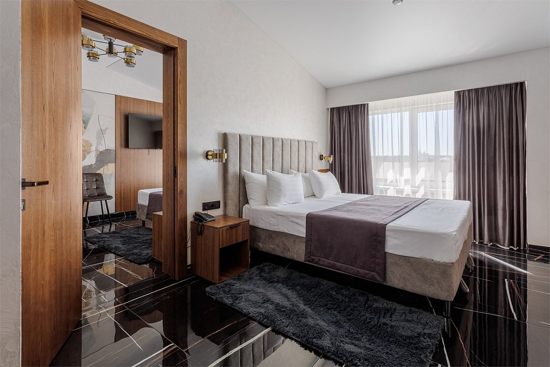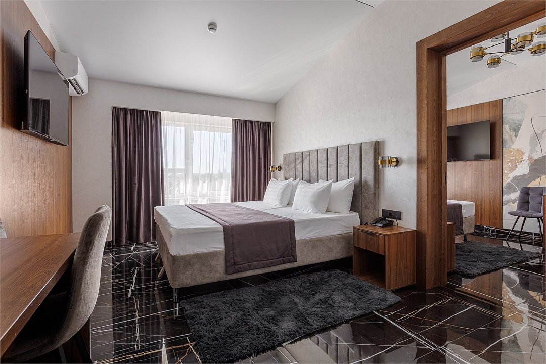 Стандартный двухкомнатный номер: две двуспальные кровати (King-Size) 180*200 Площадь - 53 кв.м., рассчитан на 1- 4 человек. Виды из окон на город В номере современная отделка, продвинутая система вентиляции и поступления очищенного воздуха. К услугам гостей: Электронный сейф, мини-холодильник, стол, электрический чайник и набор для приготовления чай/кофе, фен, в каждой комнате LCD телевизор-55", бесплатный Wi-Fi, телефон, корзина для мусора, тапочки, халат, два санузла (с душевыми), полотенцесушитель, принадлежности для душа премиального качества. Есть вариант тарифа размещения как с завтраком, так и без него.Услуги и удобства