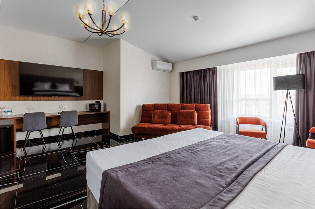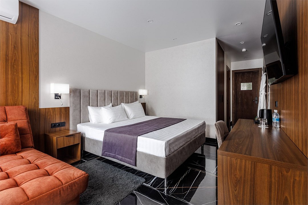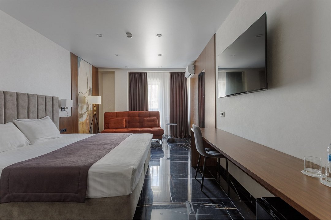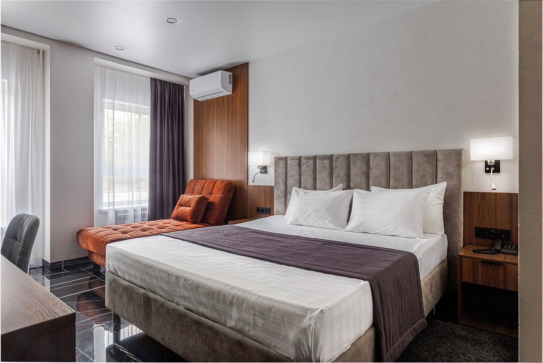 Стандартный однокомнатный улучшенный номер с двуспальной кроватью King-Size (180*200) и диваном 120*200 (раскладывается для 2-х человек). Площадь номера - до 27 кв.м., рассчитан на 1-4 человек. Виды из окон на город. В номере современная отделка, продвинутая система вентиляции и поступления очищенного воздуха. К услугам гостей: Электронный сейф, мини-холодильник, стол, электрический чайник и набор для приготовления чай/кофе, фен, LCD телевизор-55", бесплатный Wi-Fi, телефон, корзина для мусора, тапочки, халат, душевая (в санузле), полотенцесушитель, принадлежности для душа премиального качества. Есть вариант тарифа размещения как с завтраком, так и без него. В данной категории есть номера с небольшими французскими балкончиками, так и без них, уточняйте при бронировании предпочтительный вариант.Услуги и удобства
