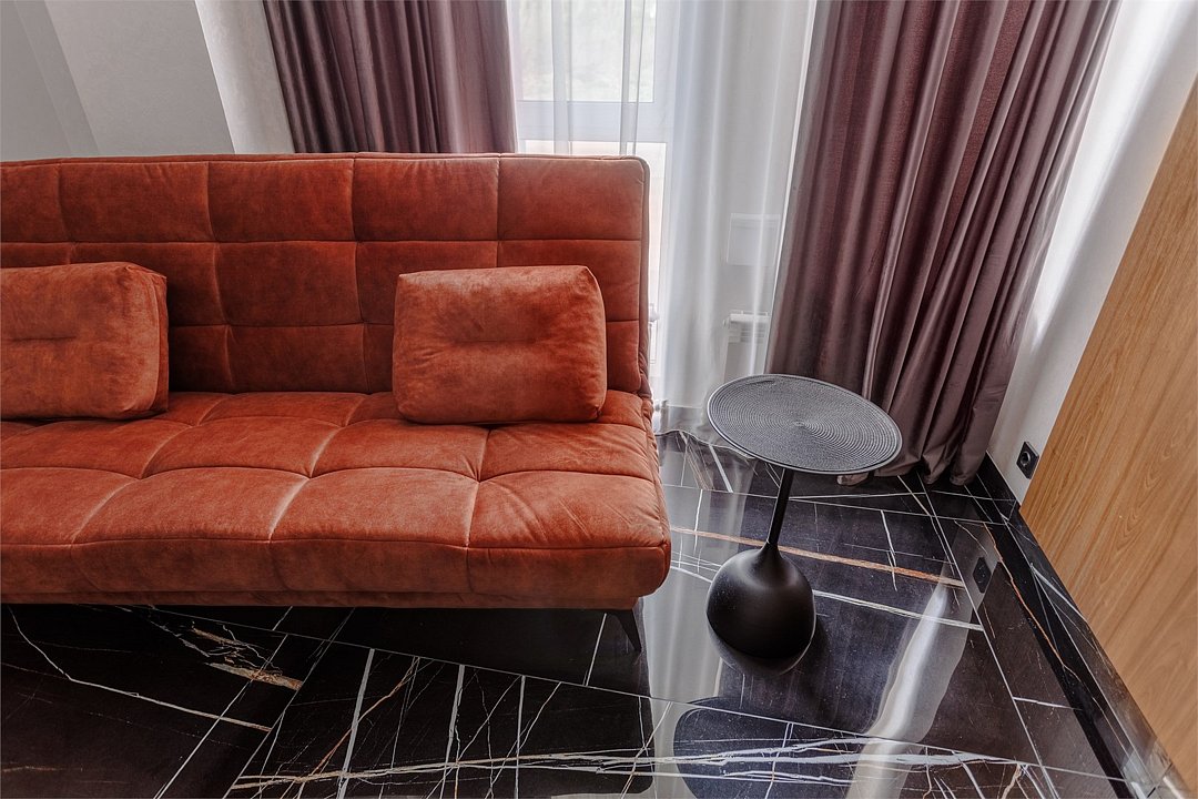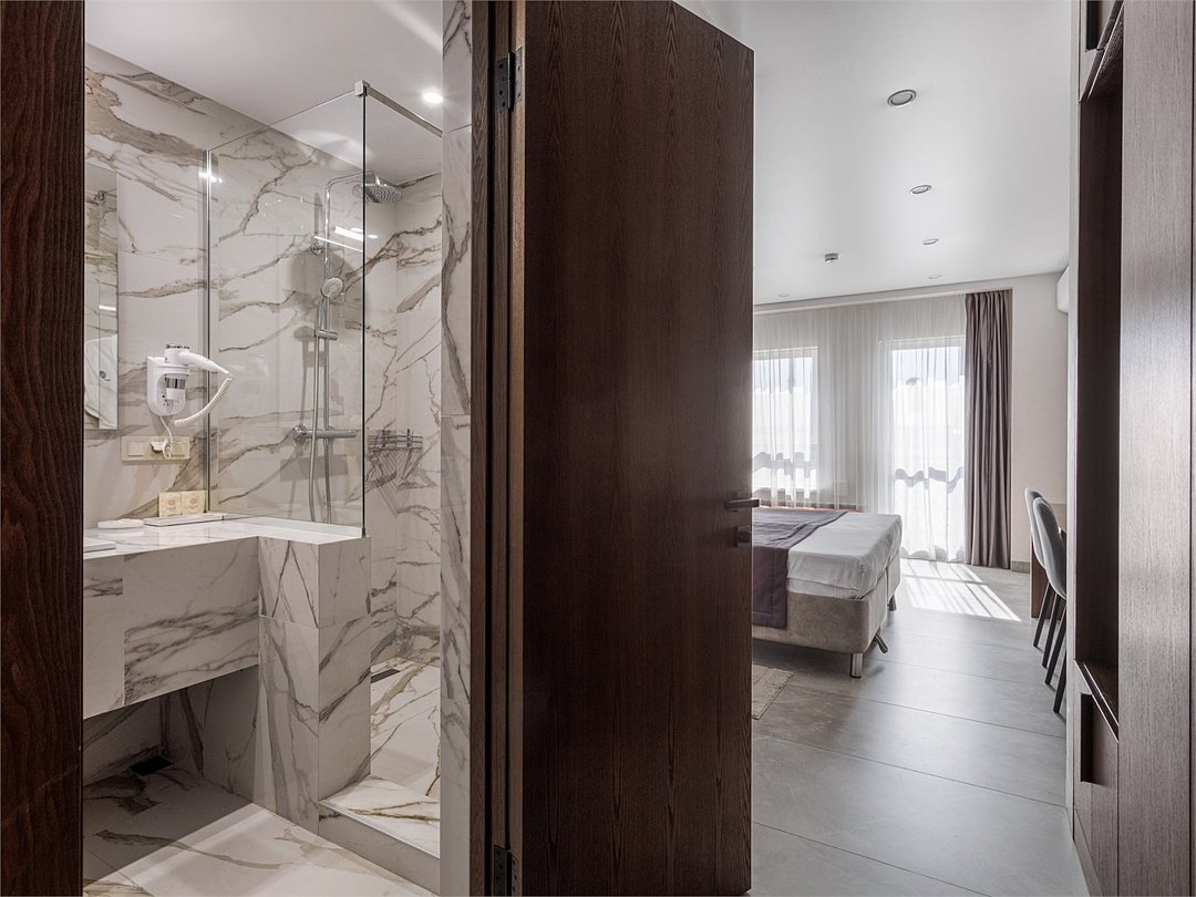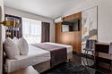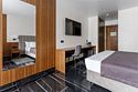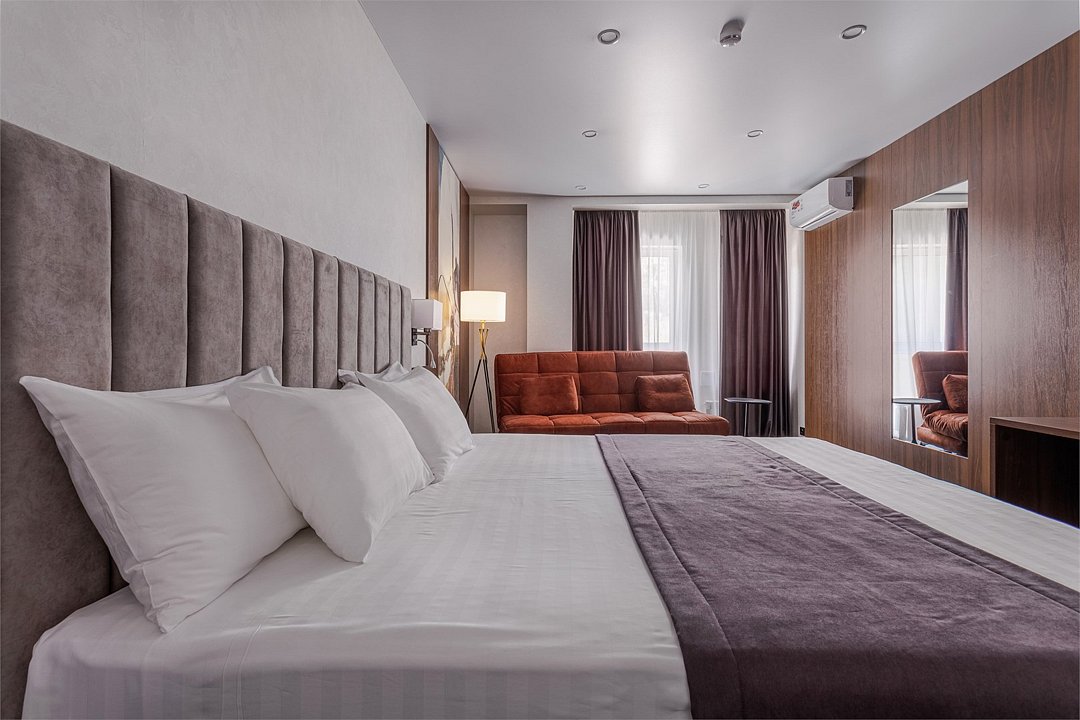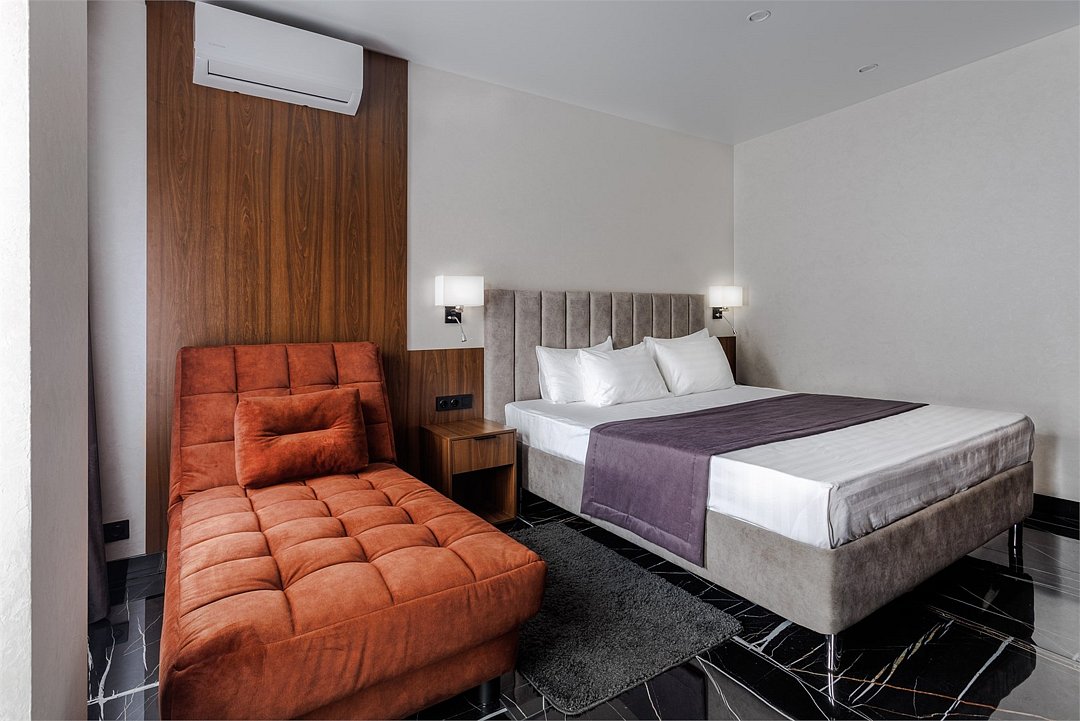 Стандартный однокомнатный улучшенный номер с двуспальной кроватью King-Size (180*200) и диваном 120*200 (раскладывается для 2-х человек). Площадь номера - до 27 кв.м., рассчитан на 1-4 человек. Виды из окон на город. В номере современная отделка, продвинутая система вентиляции и поступления очищенного воздуха. К услугам гостей: Электронный сейф, мини-холодильник, стол, электрический чайник и набор для приготовления чай/кофе, фен, LCD телевизор-55", бесплатный Wi-Fi, телефон, корзина для мусора, тапочки, халат, душевая (в санузле), полотенцесушитель, принадлежности для душа премиального качества. Есть вариант тарифа размещения как с завтраком, так и без него. В данной категории есть номера с небольшими французскими балкончиками, так и без них, уточняйте при бронировании предпочтительный вариант.Услуги и удобства