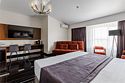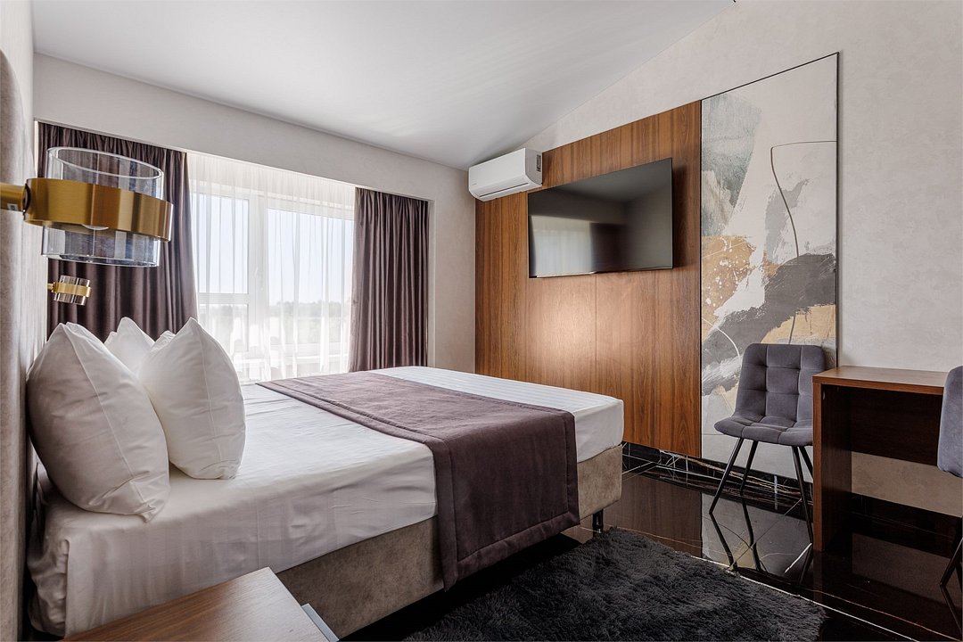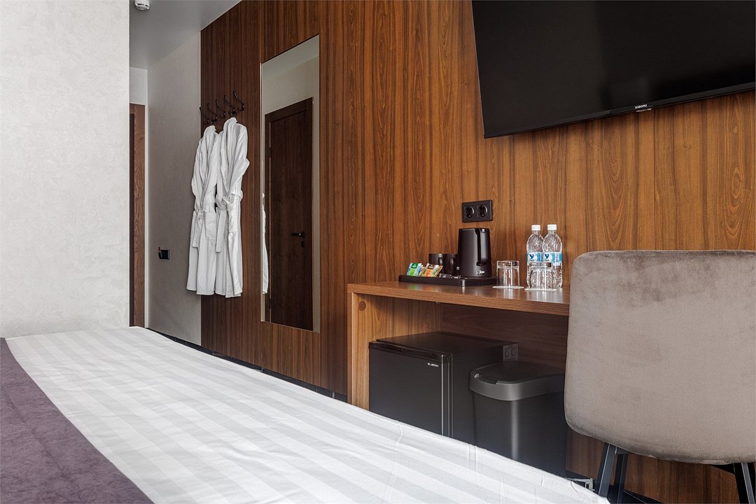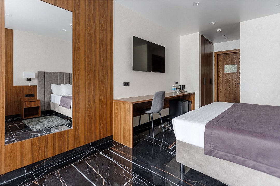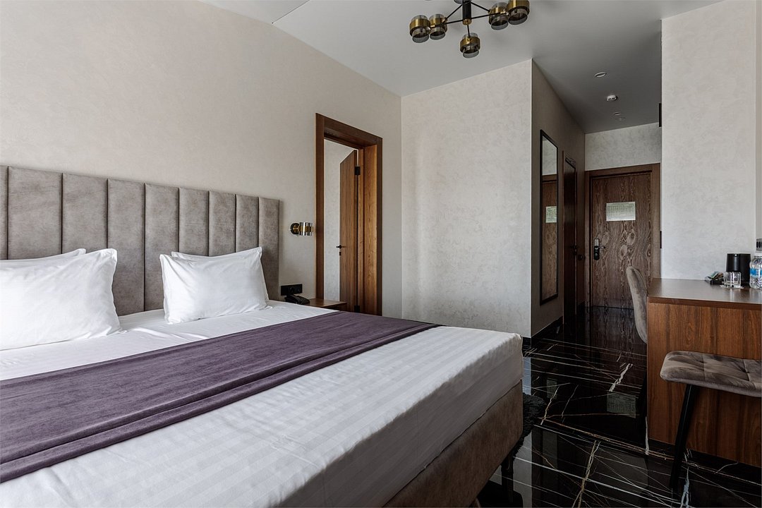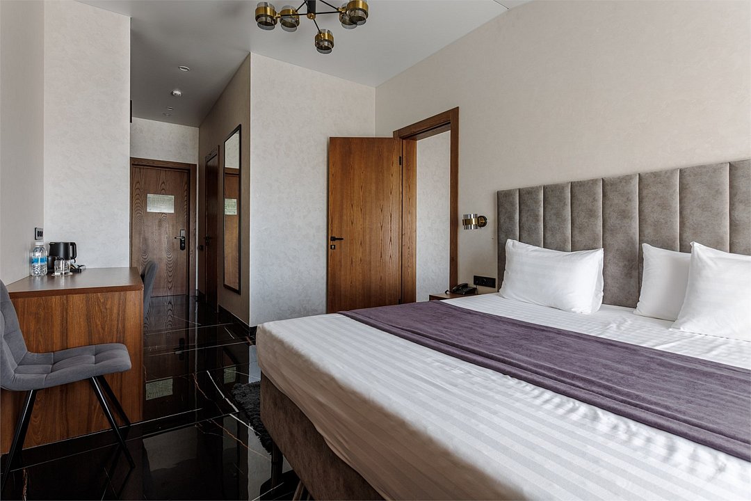 Стандартный однокомнатный уютный номер с двуспальной кроватью King-Size (180*200). и кресло (раскладывается для 1-го человека). Площадь номера - до 27 кв.м., рассчитан на 1-3 человек. Виды из окон на город. В номере современная отделка, продвинутая система вентиляции и поступления очищенного воздуха. К услугам гостей: Электронный сейф, мини-холодильник, стол, электрический чайник и набор для приготовления чай/кофе, фен, LCD телевизор-55", бесплатный Wi-Fi, телефон, корзина для мусора, тапочки, халат, душевая (в санузле), полотенцесушитель, принадлежности для душа премиального качества. Есть вариант тарифа размещения как с завтраком, так и без него.Услуги и удобства