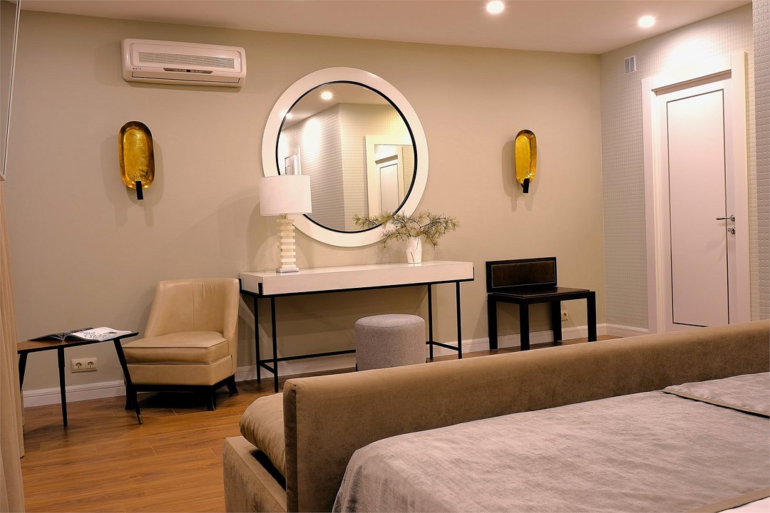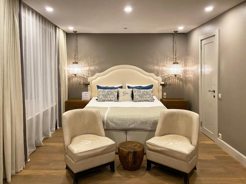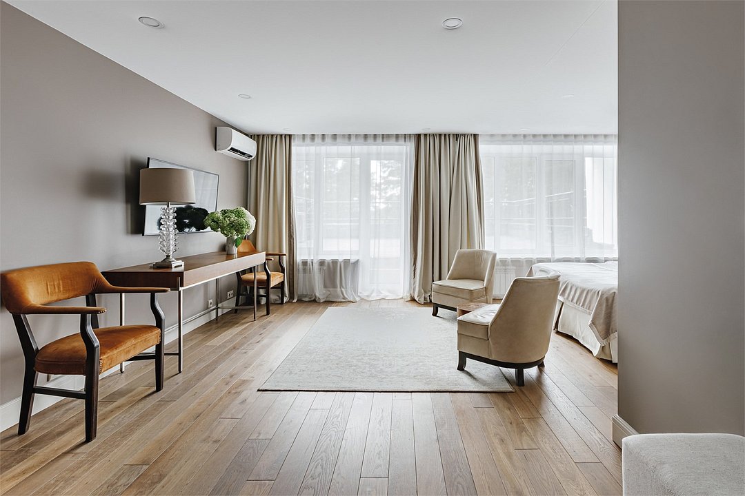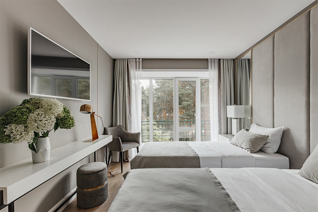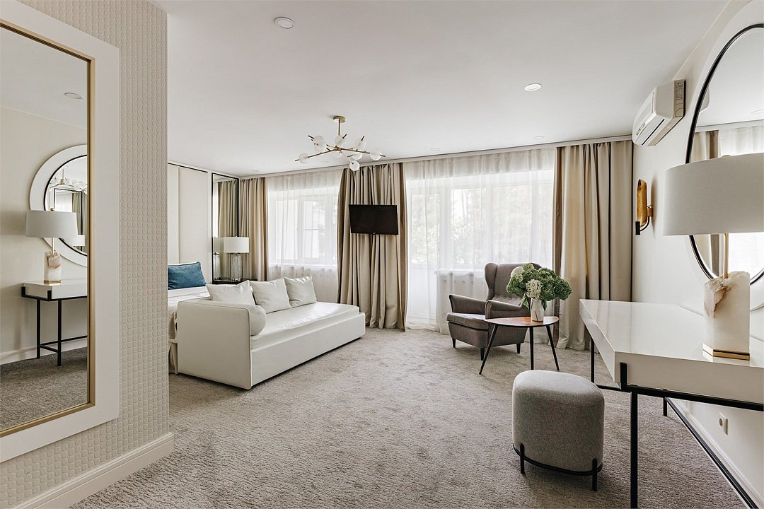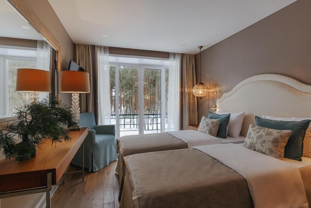 Wi-Fi, интернет, кондиционер, светильник, настольные лампы, фен, ванная комната, ванна, санузел, тапочки, кровать «King size», две односпальные кровати, кресла, шкаф для одежды, вешалки, зеркало, эксклюзивная мебель, чайный набор, минеральная вода, чайник, питьевая вода, отопление, вид во двор, паркет, стаканы, стол, туалет, цифровое тв, телевизор с плоским экраном, мини-холодильник, телевизор со Smart TV, вид на лесВ гостиничном номере