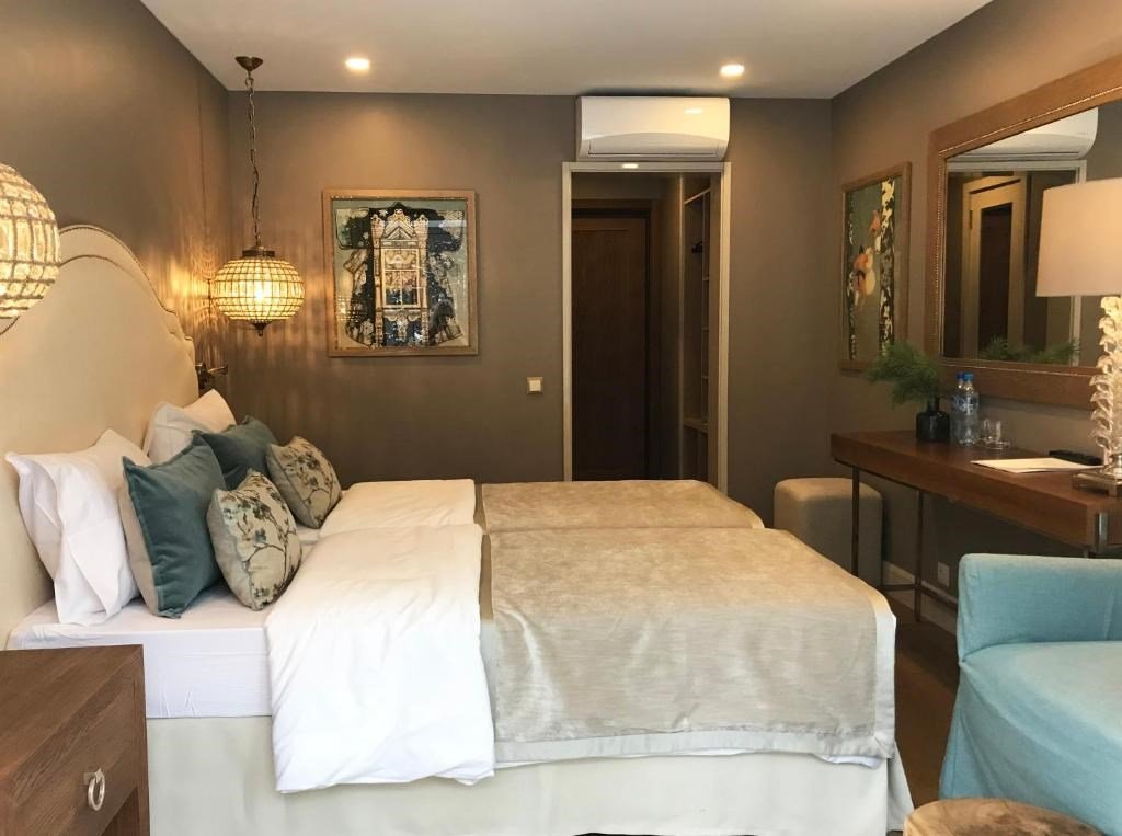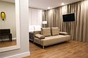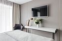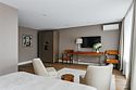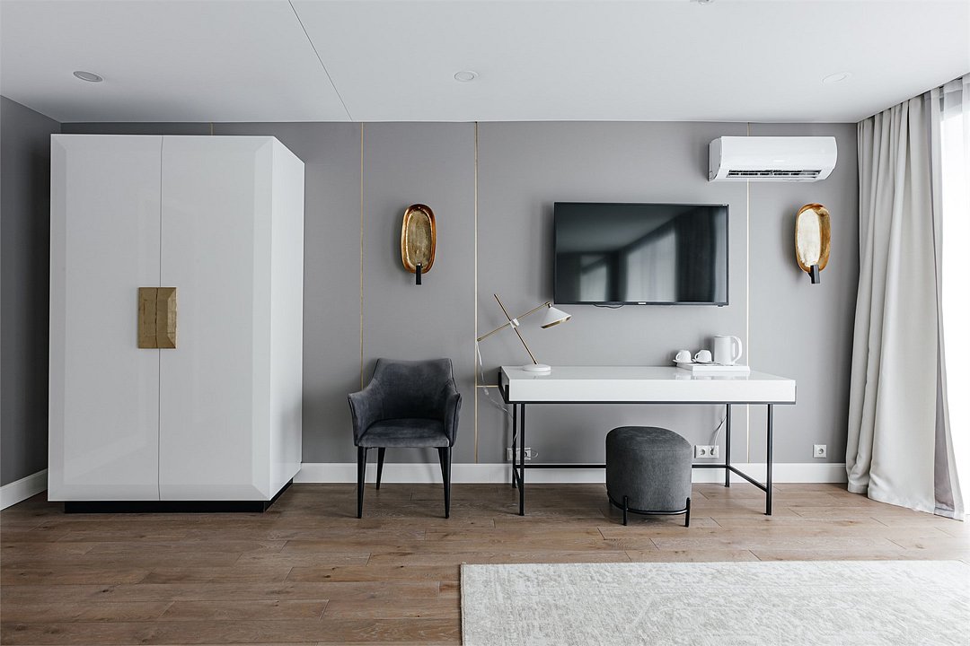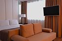спутниковое телевидение, Wi-Fi, кондиционер, светильник, настольные лампы, фен, ванная комната, ванна, банные полотенца, тапочки, гигиенические средства, балкон, балкон с красивым видом, двуспальная кровать, две односпальные кровати, тумбы, шкаф для одежды, вешалки, письменный стол, зеркало, обслуживание номеров, унитаз, раковина, питьевая вода, отопление, кресло, паркет, стаканы, панорамные окна, телевизор с плоским экраном, номер для некурящих, пуфикВ гостиничном номере