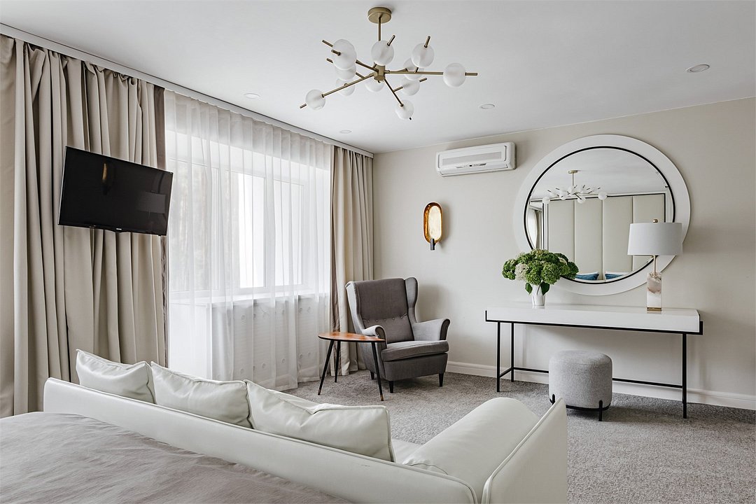 Wi-Fi, интернет, телефон, холодильник, кондиционер, светильник, настольные лампы, фен, ванная комната, ванна, санузел, тапочки, балкон, кровать «King size», односпальная кровать, шкаф для одежды, вешалки, журнальный столик, зеркало, ковер, эксклюзивная мебель, чайный набор, минеральная вода, чайник, питьевая вода, ковровое покрытие, отопление, кресло, стаканы, стул, стол, туалет, цифровое тв, телевизор с плоским экраном, мини-холодильник, телевизор со Smart TV, номер для некурящих, вид на лес, пуфикВ гостиничном номере