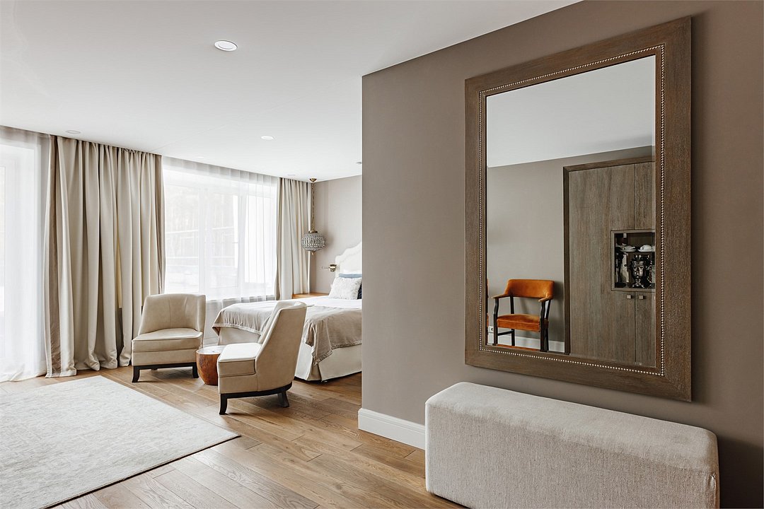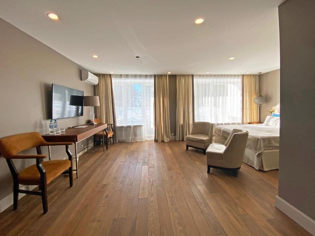 Wi-Fi, интернет, кондиционер, светильник, настольные лампы, фен, ванная комната, ванна, санузел, тапочки, кровать «King size», двуспальная кровать, кресла, шкаф для одежды, вешалки, зеркало, эксклюзивная мебель, чайный набор, минеральная вода, чайник, питьевая вода, отопление, вид во двор, паркет, стаканы, стол, туалет, цифровое тв, телевизор с плоским экраном, мини-холодильник, телевизор со Smart TV, вид на лесВ гостиничном номере
