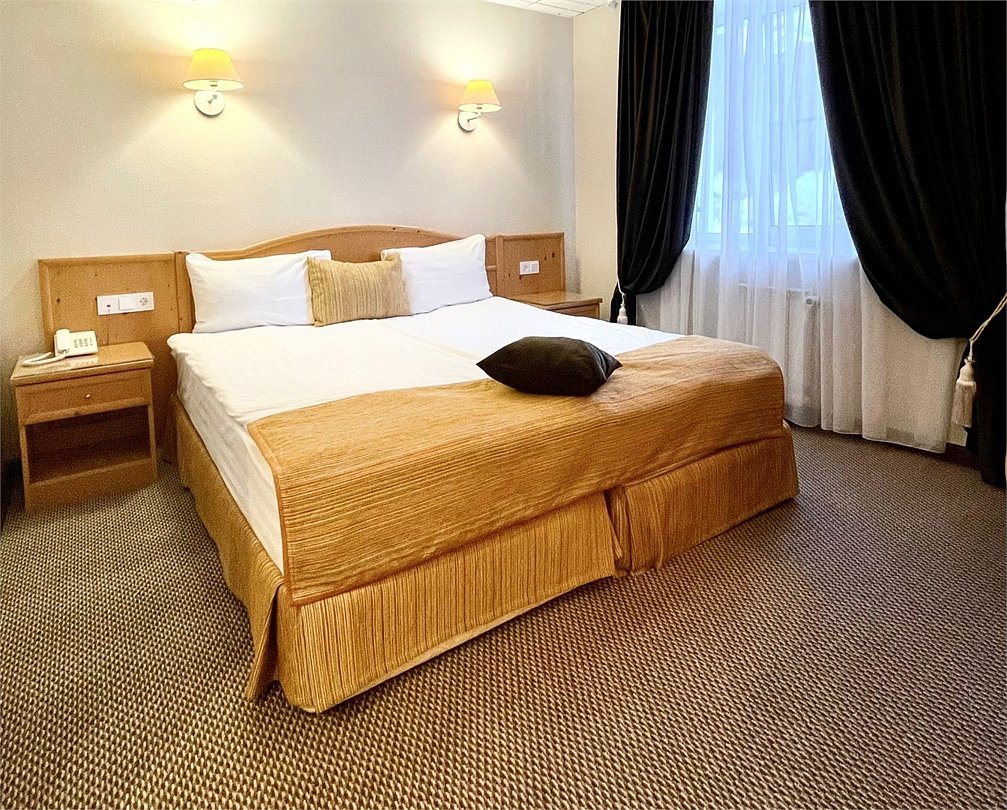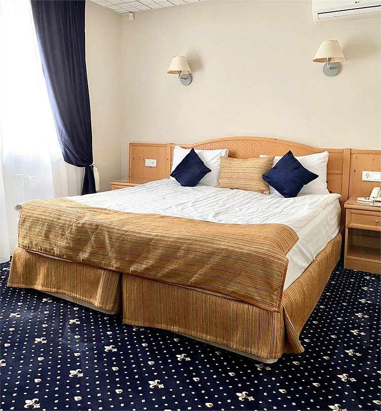 Wi-Fi, телефон, кондиционер, фен, ванная комната, халаты, тапочки, кровать «King size», две односпальные кровати, тумбы, письменный стол, багажная тумба, зеркало, чайный набор, сейф, ковровое покрытие, отопление, вид во двор, столовые приборы, стул, телевизор с плоским экраном, мини-холодильник, шкаф-купе, теплые полы, номер для некурящих, гигиенический душ, кресло-кровать, вешалки-плечики, мини-бар (платно), затемняющая штораВ гостиничном номере