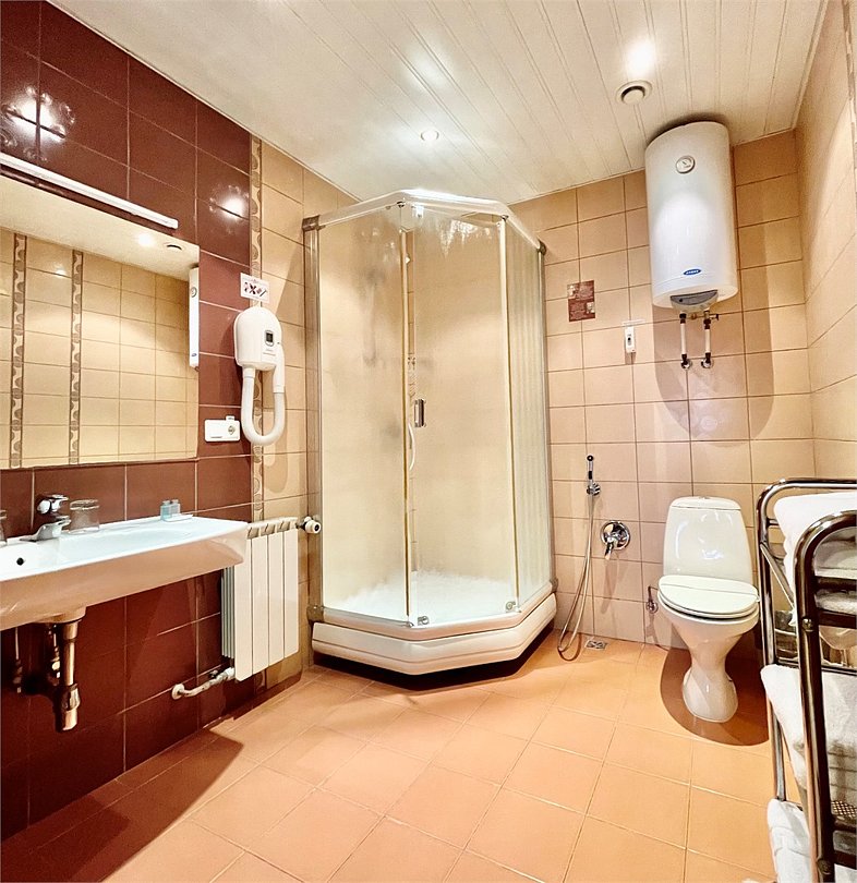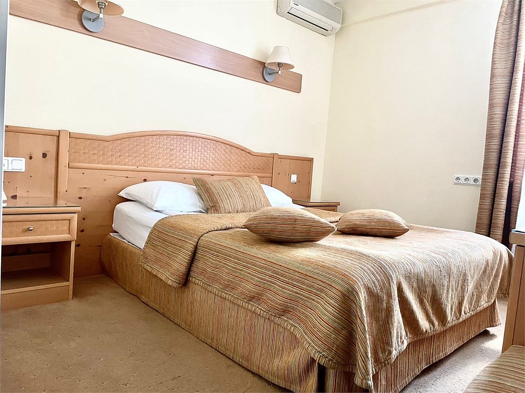 В этом уютном и светлом номере вы почувствуете себя как дома. Стены, окрашенные в теплые оттенки, создают атмосферу спокойствия и умиротворения. Деревянная мебель придает интерьеру нотки естественности и гармонии, а удобная кровать словно создана для крепкого и сладкого сна. Светильники, размещённые у изголовья, излучают мягкий, расслабляющий свет, который располагает к уютным вечерам за чтением или размышлениями. Рабочий уголок оборудован всем необходимым для продуктивной работы или легкого отдыха с чашечкой чая. Современный телевизор и аккуратный стол дополняют общий стиль комнаты, создавая пространство, в котором легко можно переключиться с дел на отдых и наоборот. Ванная комната удивляет своей функциональностью и стилем. Прозрачные дверцы душевой кабины, сверкающая чистотой плитка и продуманные до мелочей детали — всё это создано для вашего комфорта и удобства. Оснащение номера: Двуспальная кровать Телевизор Письменный стол и стул Кондиционер Просторный шкаф для одежды Зеркало Прикроватные тумбочки Душевая кабина Набор полотенец Туалетные принадлежности Махровый халат Тапочки Фен Этот номер — идеальное место для тех, кто ценит комфорт и уют в каждой детали.Услуги и удобства