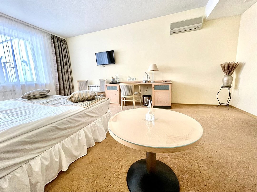 Этот номер представлен как уютное и современное пространство для комфортного отдыха. Интерьер выполнен в нежных голубых и бежевых тонах, создающих атмосферу покоя и уюта. Мягкое освещение создаёт атмосферу домашнего уюта, а большие окна заполняют пространство естественным светом, открывая вид на окружающий мир. Просторная кровать обещает вам крепкий и спокойный сон, который поможет восстановить силы после активного дня. В номере предусмотрено все необходимое для комфортного пребывания, включая просторную двуспальную кровать, мягкий диван для отдыха и рабочее место с письменным столом и стулом. Телевизор размещен напротив кровати, что позволяет наслаждаться просмотром любимых программ прямо из зоны отдыха. Просторная ванная комната оборудована душевой кабинкой и всеми необходимыми удобствами. Оснащение номера: Двуспальная кровать Телевизор Письменный стол и стул Мягкое кресло Кондиционер Просторный шкаф для одежды Зеркало Прикроватные тумбочки Душевая кабина Набор полотенец Туалетные принадлежности Махровый халат Тапочки ФенУслуги и удобства