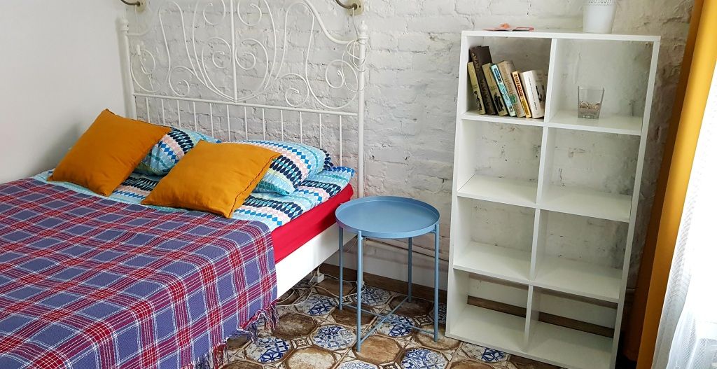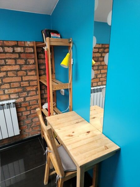 Комната небольшого размера. В общем пользовании имеется стационарный фен, утюг, гладильная доска. На нижнем этаже в распоряжении гостей кухня с холодильником, чаем, м/в печью и стиральной машиной (печка отсутствует).