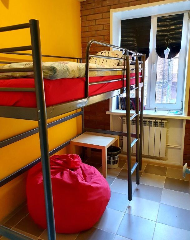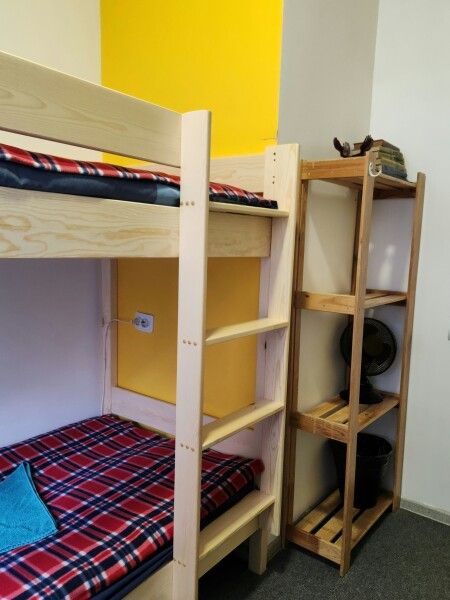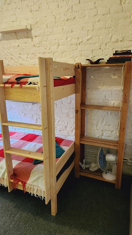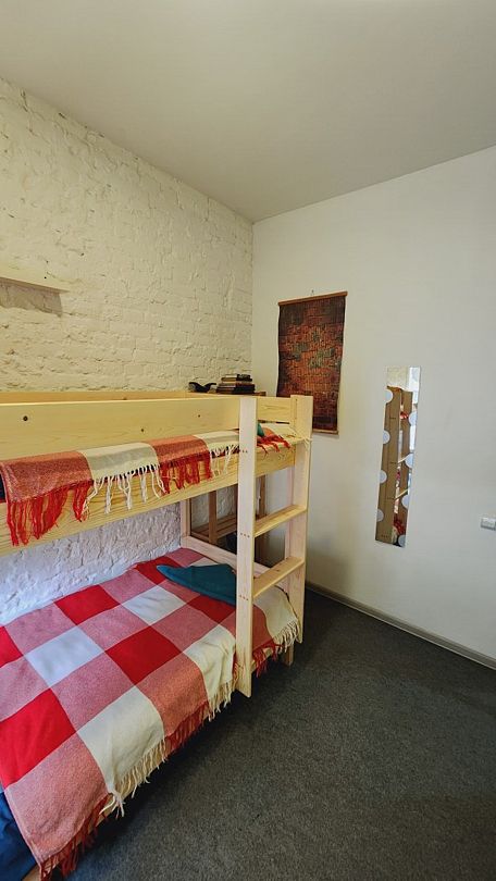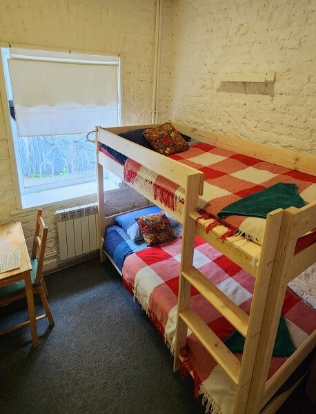 Небольшая двухместная комната с двумя раздельными спальными местами в виде двухъярусной кровати и общими удобствами.