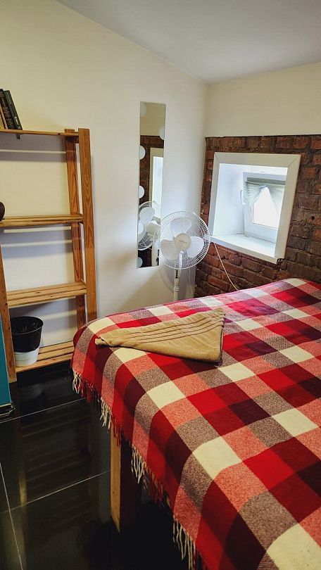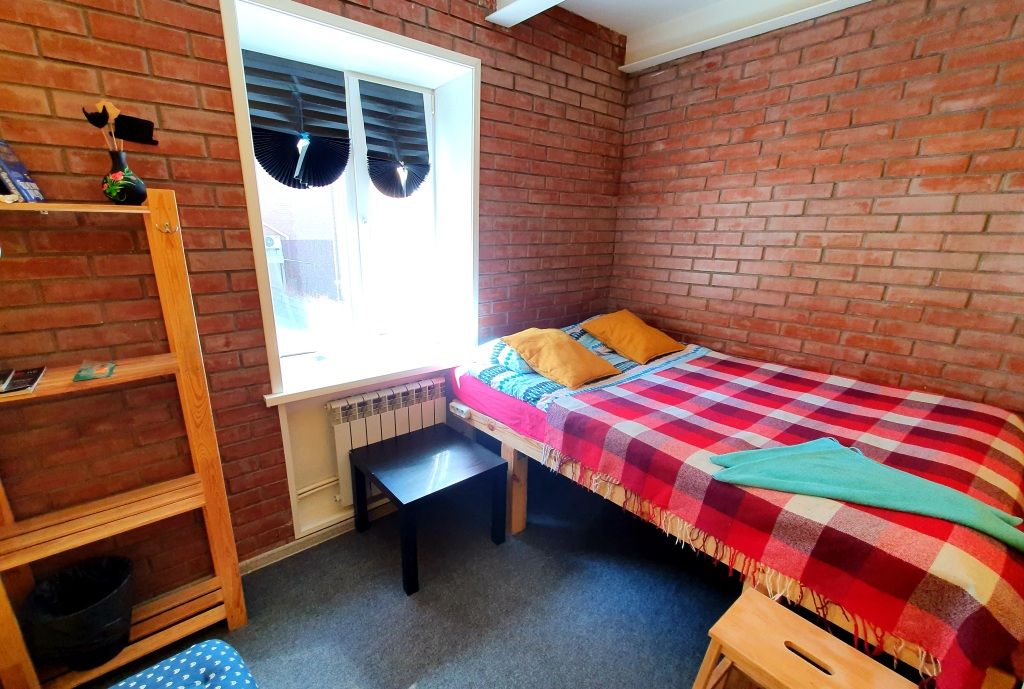 Небольшая двухместная комната с двуспальной кроватью и общими удобствами. В комнате нет телевизора и кондиционера (только вентилятор).