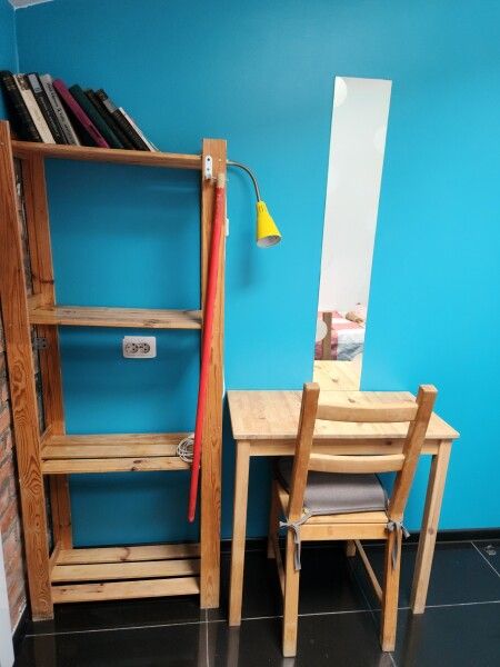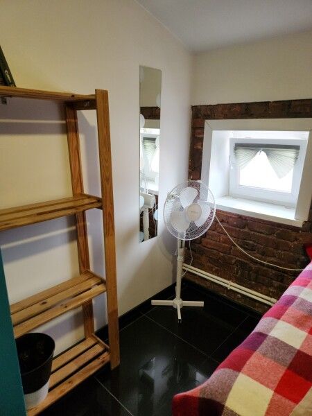 В комнате есть двуспальная кровать, стул, стеллаж, зеркало, вентилятор, светильник и крючки для одежды. Душ и туалет общие на этаже.