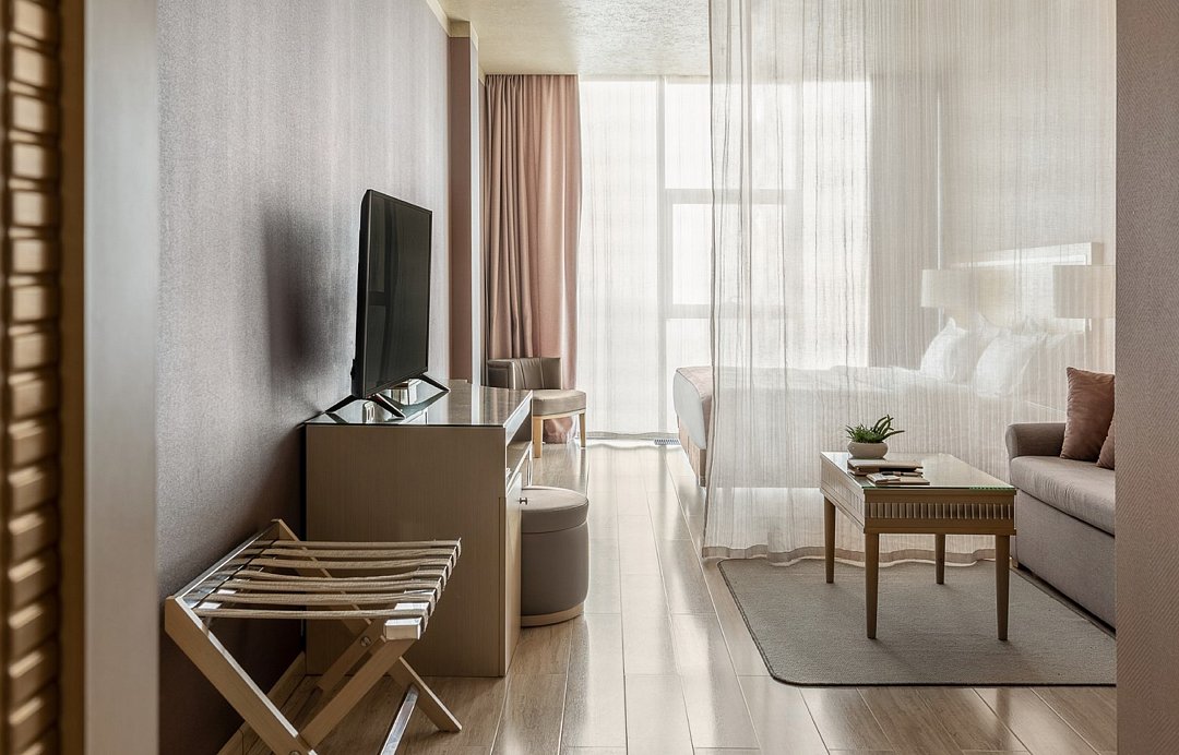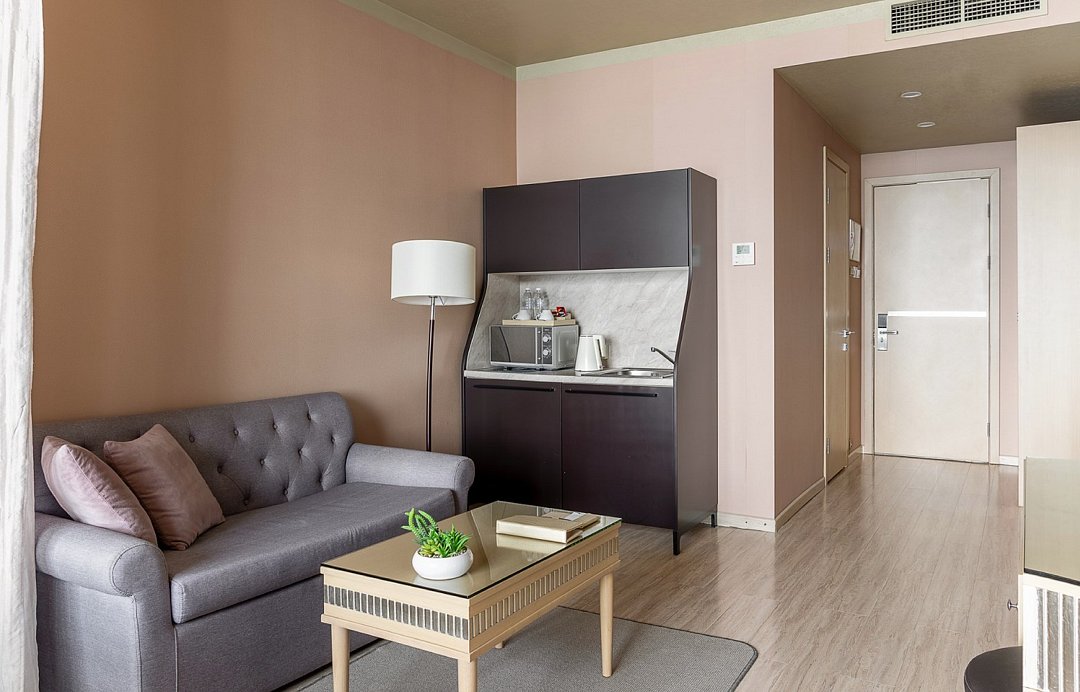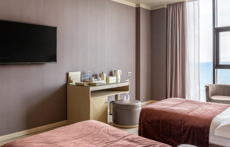В этом номере абсолютно все ориентировано на комфорт и удовольствие от пребывания. В интерьере номера гармонично сочетаются простота и изысканность. Раздельные кровати позволяют более гибко подходить к организации отдыха и обеспечивают спокойный сон. Открывающийся из панорамных окон морской пейзаж окутывает умиротворением. Кухонная зона оснащена всем необходимым — от микроволновой печи для быстрых перекусов до уютной чайной зоны. Это удобство и свобода выбора, добавляют нотку домашнего уюта. Система кондиционирования обеспечивает комфортную температуру, позволяя наслаждаться свежестью в жаркие дни и теплом в прохладные вечера.Услуги и удобства