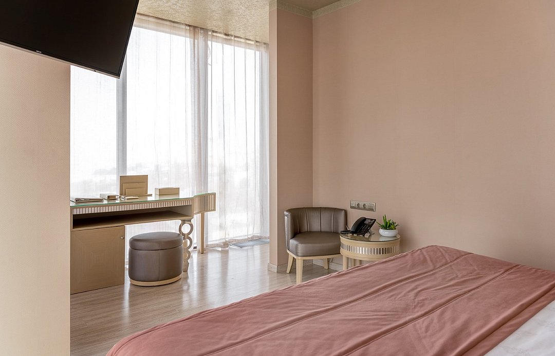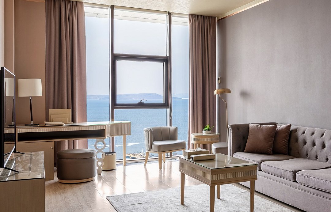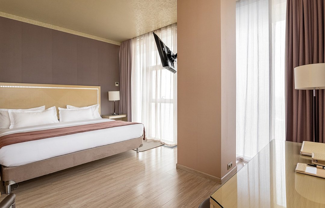 Элегантный дизайн, изысканные оттенки и стильная мебель - составляющие уюта и стиля. Благодаря панорамным окнам от пола до потолка можно в любое время суток любоваться открывающимися видами. Уютная спальня с комфортабельной кроватью предлагает возможность для полноценного отдыха, зона гостиной с элегантной мебелью приглашает к общению, а рабочее пространство идеально подходит для проведения деловых встреч. Сьют - это не просто номер, а уникальное пространство, где все функционально и все гармонирует между собой.Услуги и удобства