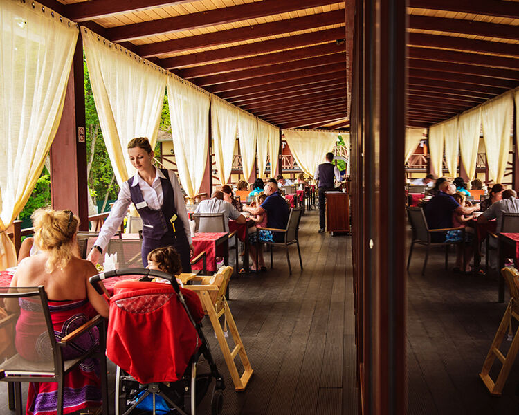 Вкусно поесть можно в кафе или ресторане с камином, летней террасой и банкетным залом, исполненном в классическом стиле. В меню европейская кухня и гриль, есть детское меню.