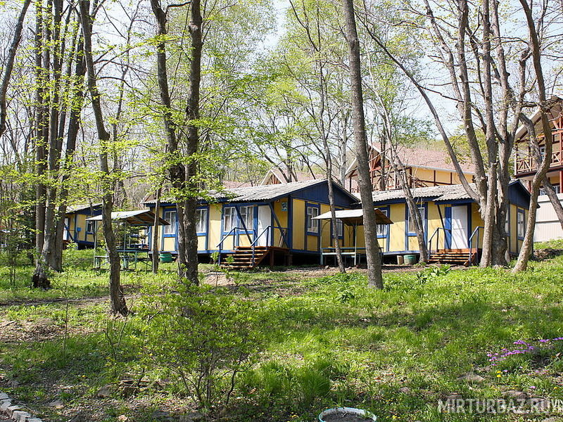 Деревянные летние домики, построены по единому проекту: небольшая прихожая и две комнаты 1 и 3-х местная. В 1 местной комнате расположена одна 1,5 спальная кровать, тумбочка, вешалка, полочка. В 3-х местной три односпальные кровати, стол, стулья, тумбочки, полочки. Туалет, умывальник на улице, имеется летний душ.