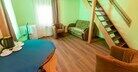 На первом этаже двухместный диван. На втором этаже две полутороспальные кровати, стол стулья, постельные принадлежности.