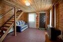 На первом этаже: двуспальный раскладной диван, стол + стулья, телевизор, холодильник, душевая кабина (горячая, холодная вода), туалет, раковина. На втором этаже спальни.