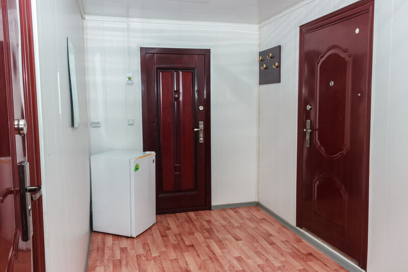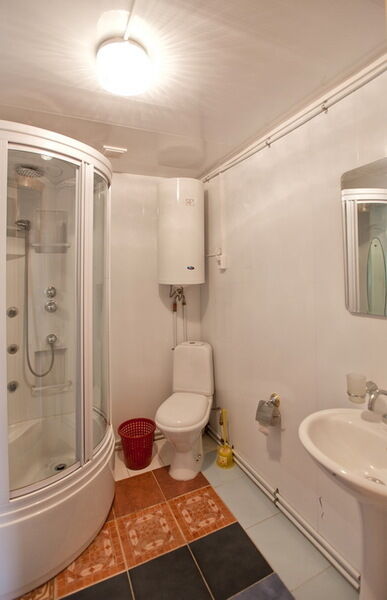 Домик подключен к электричеству, в комнатах мебель, холодильник, рядом с домиком туалетная комната, душ (платный) с горячей и холодной водой, душ (бесплатный) с холодной водой.