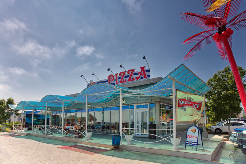 Готовить в домиках запрещено. Для проживающих предусмотренно комплексное питание. На территории расположены два ресторана "Круиз" и "Летучая рыба". Работает супермаркет.