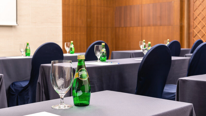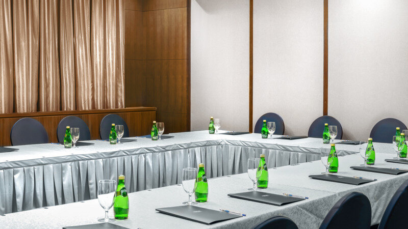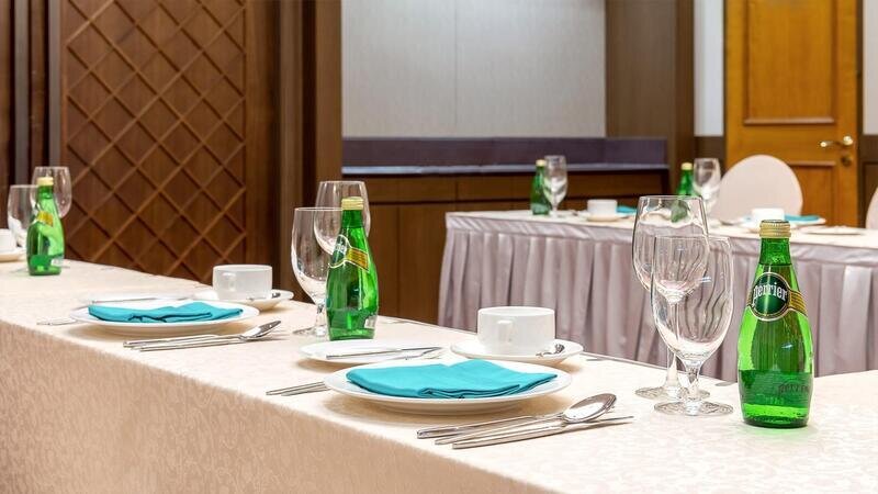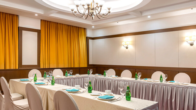 Банкетный зал «Изумрудный» с высокими потолками и естественным освещением, оформленный в классическом стиле, подходит для организации небольших деловых мероприятий или частных торжеств.
