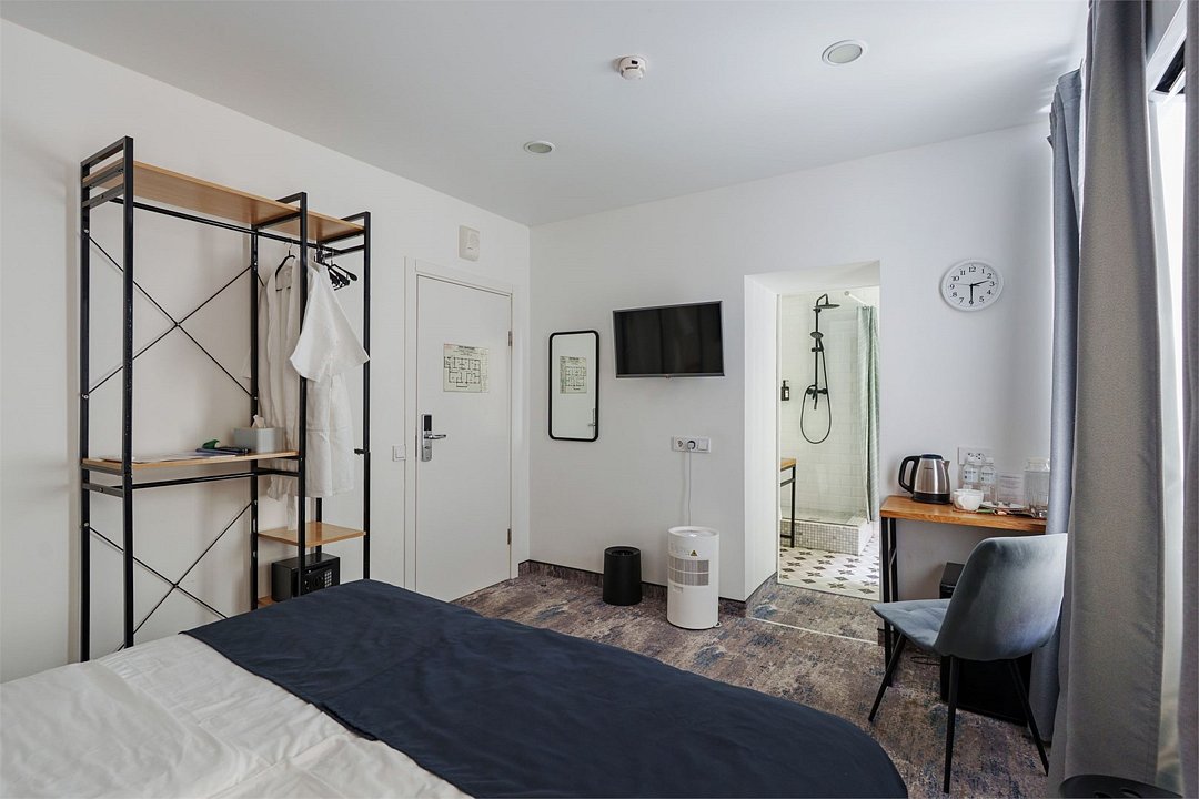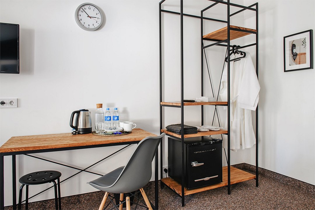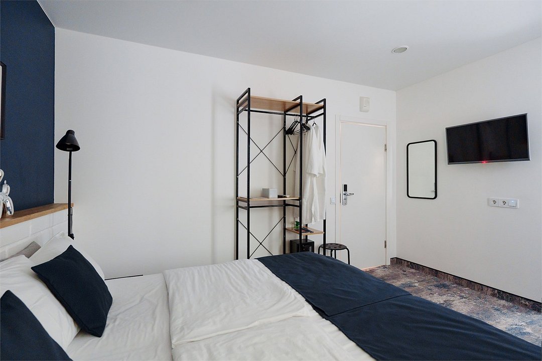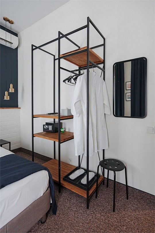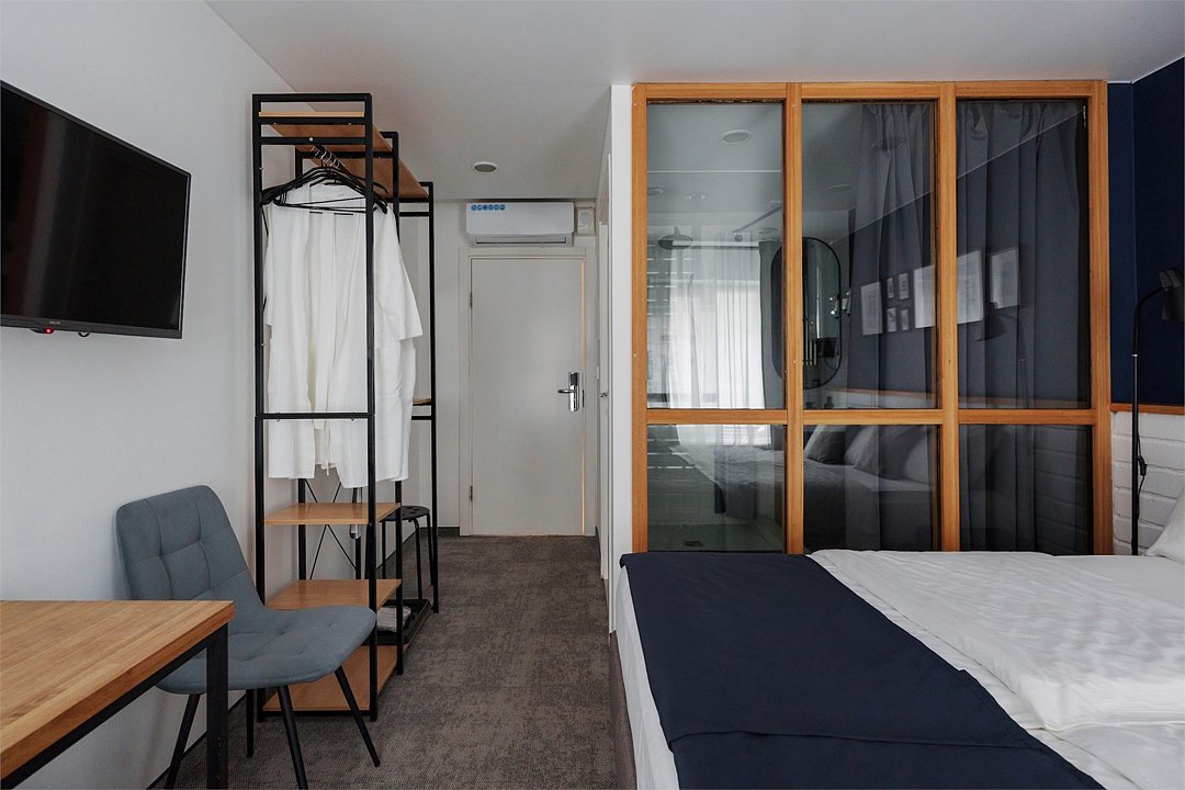 Wi-Fi, кондиционер, светильник, фен, электронные замки, утюг, ванная комната, банные принадлежности, халаты, тапочки, кровать «King size», две односпальные кровати, ортопедический матрас, тумбы, стулья, шкаф для одежды, вешалки, зеркало, эксклюзивная мебель, чайный набор, сейф, чайник, питьевая вода, отопление, кулер на этаже, вид во двор, стаканы, столовые приборы, стул, стол, туалетные средства, телевизор с плоским экраном, мини-холодильник, мансардные окна, пуфикВ номере