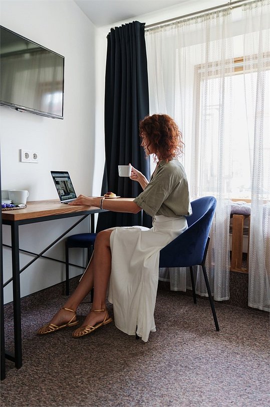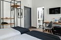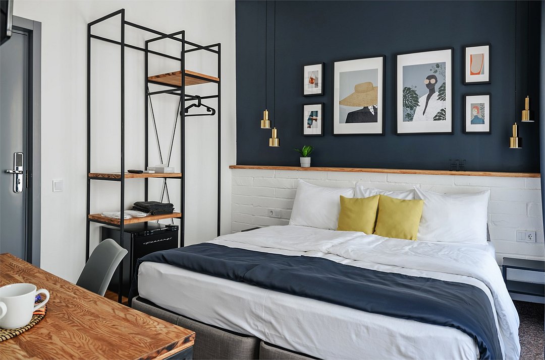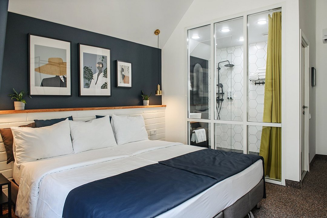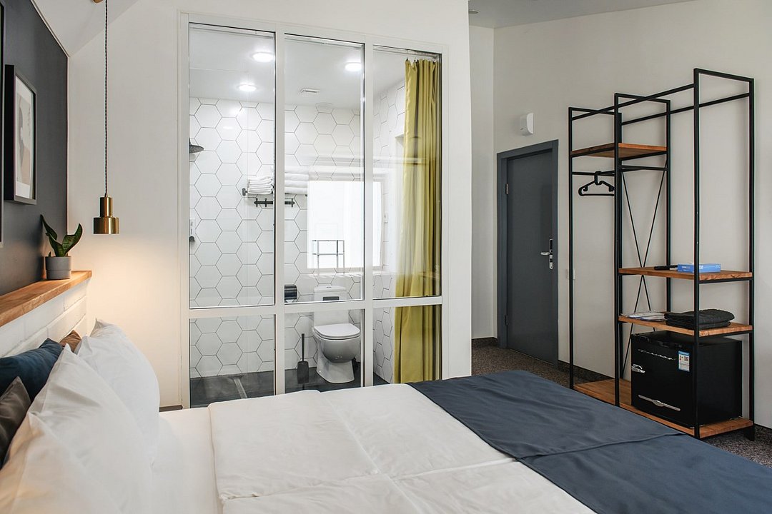 Wi-Fi, кондиционер, светильник, фен, электронные замки, утюг, ванная комната, банные принадлежности, халаты, тапочки, кровать «King size», две односпальные кровати, ортопедический матрас, тумбы, стулья, шкаф для одежды, вешалки, зеркало, эксклюзивная мебель, чайный набор, сейф, чайник, питьевая вода, отопление, кулер на этаже, вид во двор, стаканы, столовые приборы, стул, стол, туалетные средства, телевизор с плоским экраном, мини-холодильник, мансардные окна, пуфикВ номере