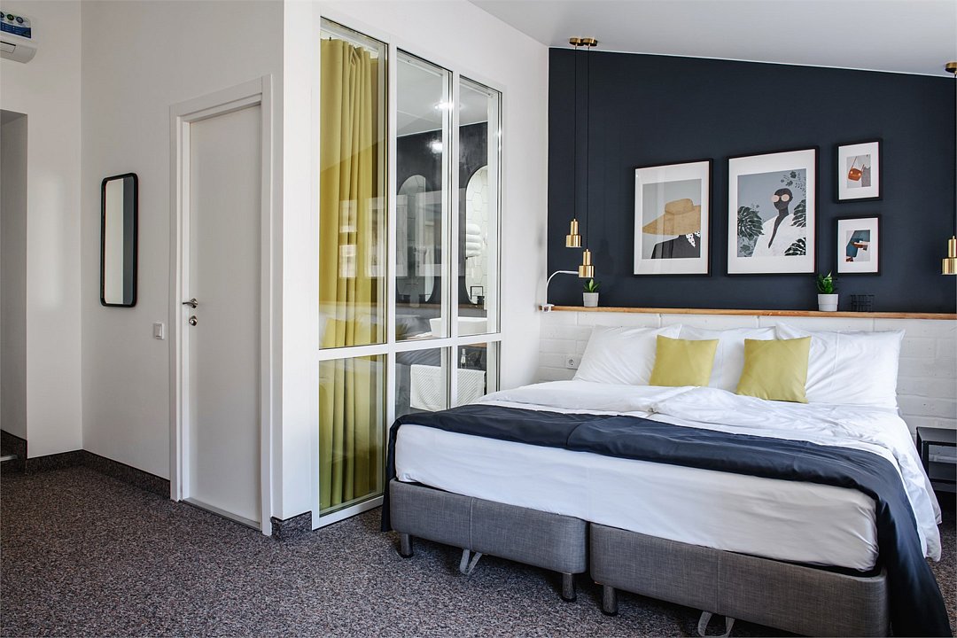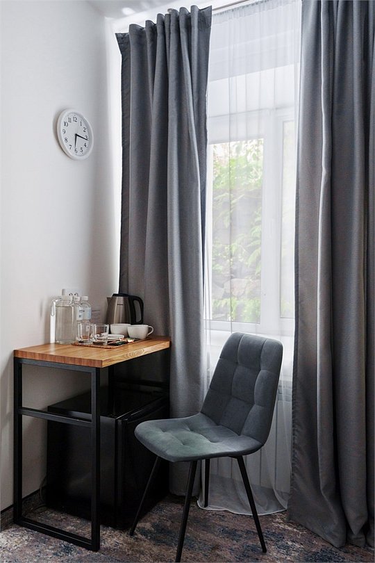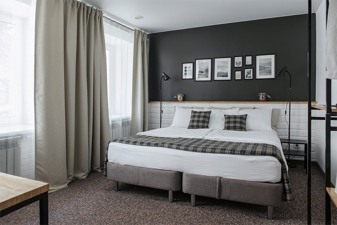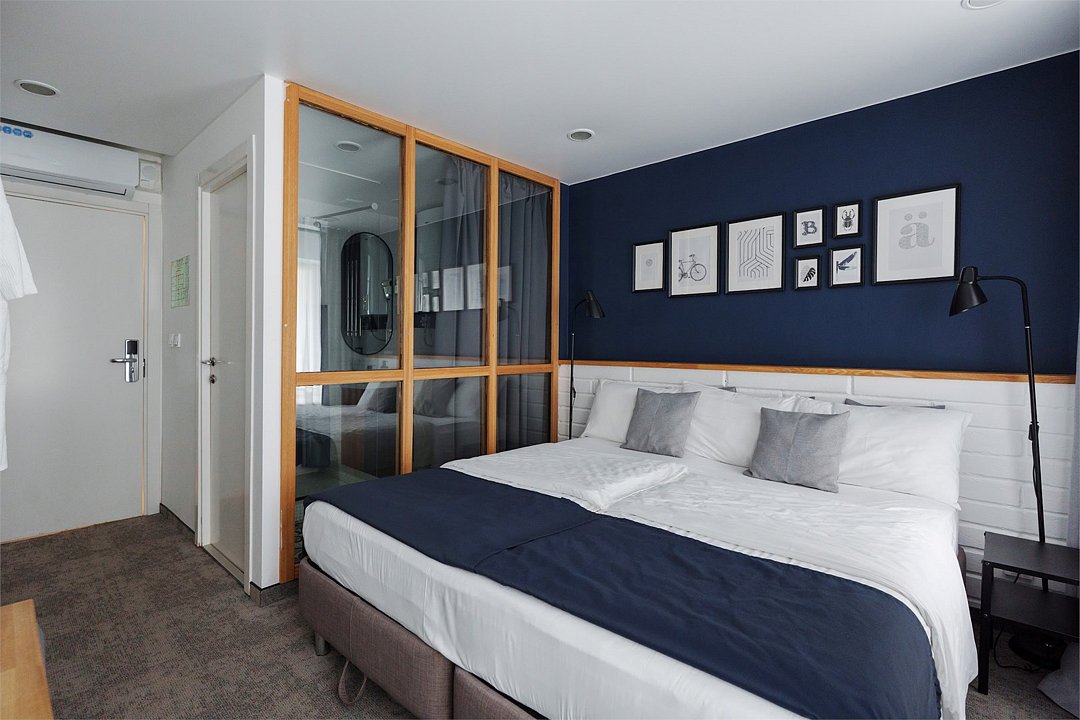 Номер с одной большой кроватью и дополнительным местом для ребенка. В номере два окна, высокие потолки.Услуги и удобства