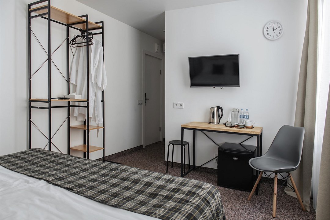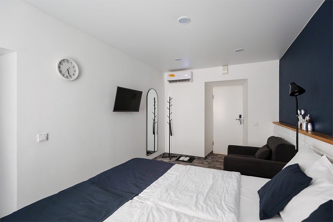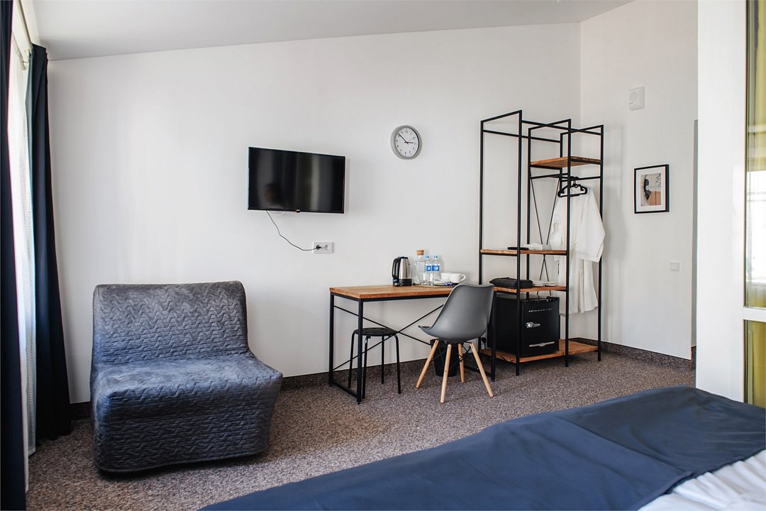 кабельное телевидение, Wi-Fi, кондиционер, светильник, фен, электронные замки, утюг, обогреватель, ванная комната, ванна или душевая кабина, банные принадлежности, халаты, банные полотенца, тапочки, кровать «King size», две односпальные кровати, ортопедический матрас, кулер на этаже, вид во двор, туалетные средства, диван-кровать, телевизор с плоским экраном, мини-холодильникВ номере