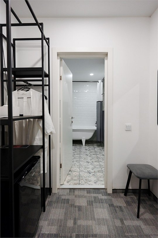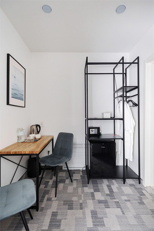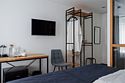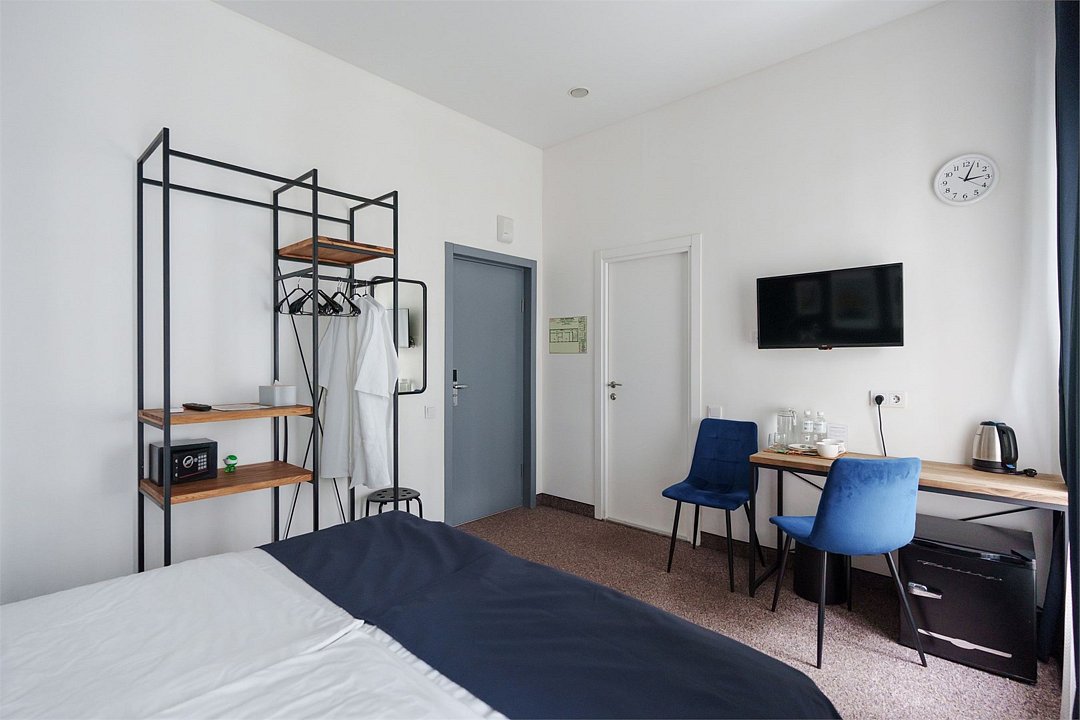 кабельное телевидение, Wi-Fi, кондиционер, светильник, фен, электронные замки, утюг, обогреватель, ванна или душевая кабина, санузел, водонагреватель, банные принадлежности, халаты, банные полотенца, тапочки, кровать «King size», две односпальные кровати, ортопедический матрас, тумбы, стулья, шкаф для одежды, вешалки, зеркало, кулер на этаже, стол, туалетные средства, телевизор с плоским экраном, мини-холодильник, пуфикВ номере