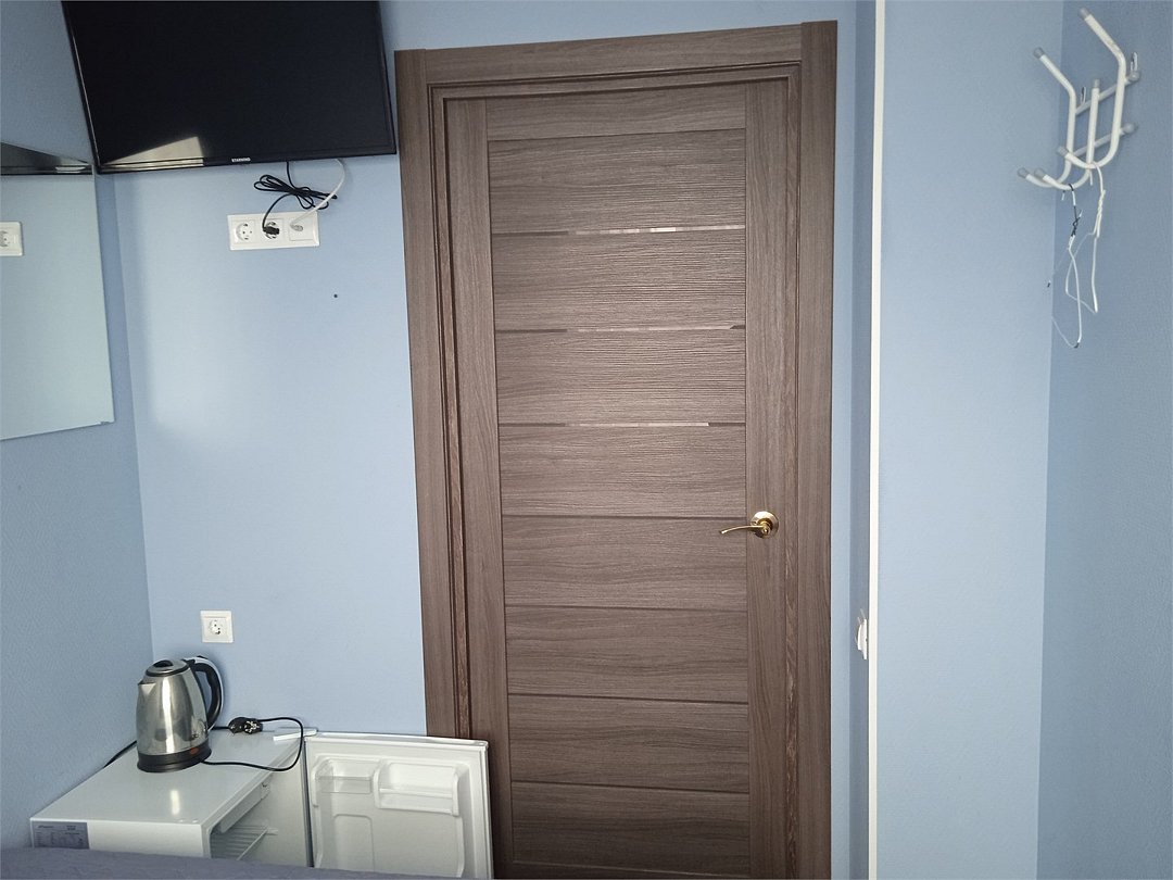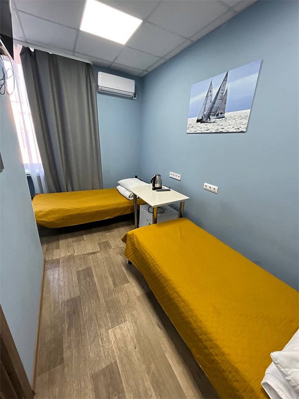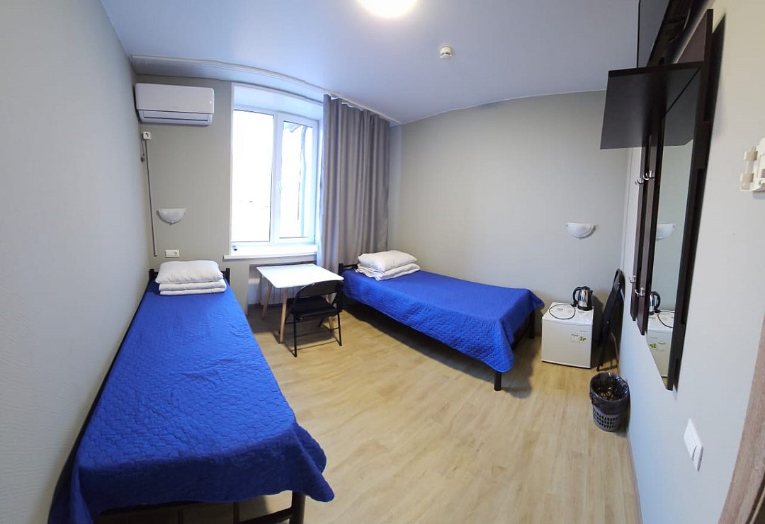 телевизор, Wi-Fi, кондиционер, светильник, две односпальные или большая двуспальная кровать, вешалки, зеркало, чайник, вид во двор, стул, стол, санузел на этаже, мини-холодильник, душ на этажеВ номере
