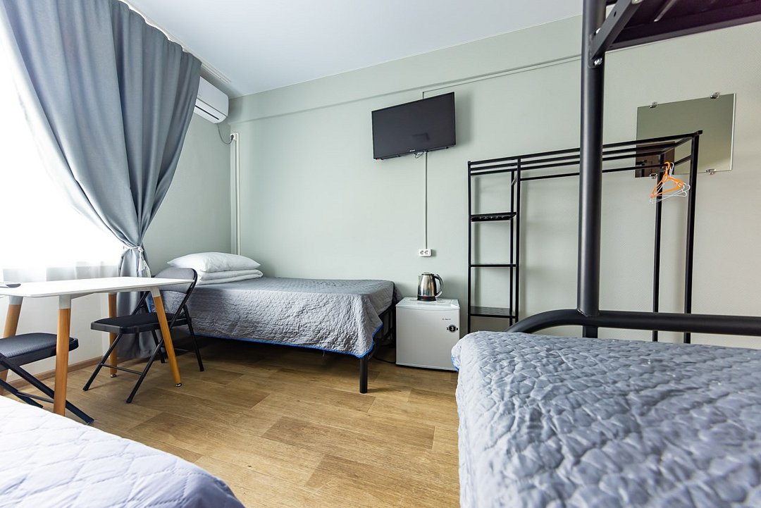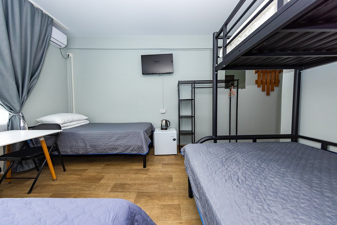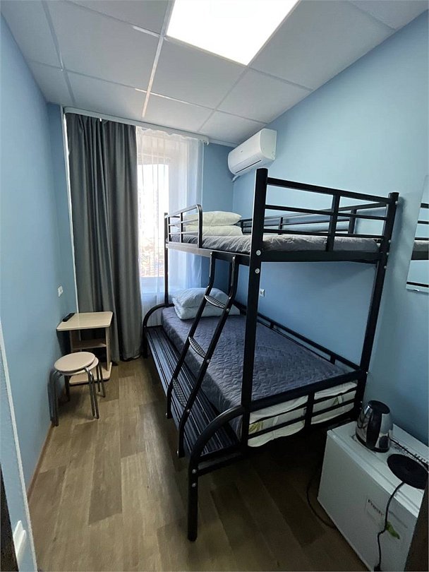 Wi-Fi, кондиционер, две односпальные или большая двуспальная кровать, вешалки, зеркало, чайник, унитаз, раковина, отопление, душ, вид на город, вид во двор, стул, стол, цифровое тв, телевизор с плоским экраном, мини-холодильник, двухъярусная кроватьВ номере