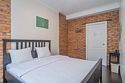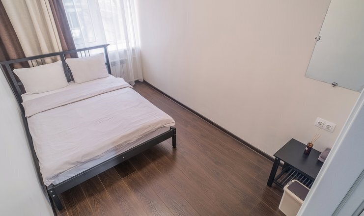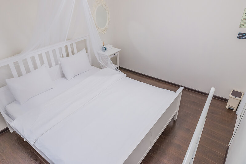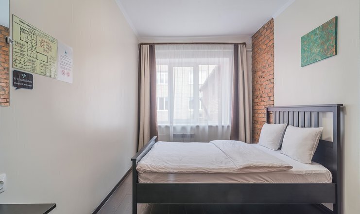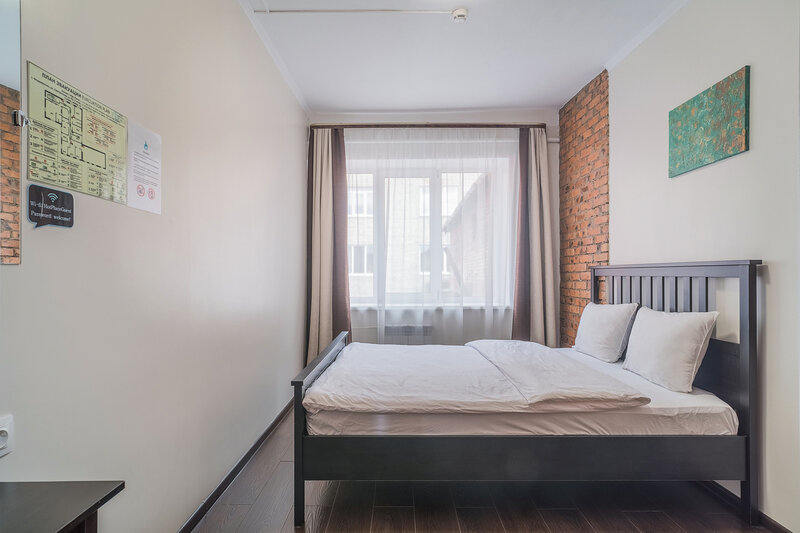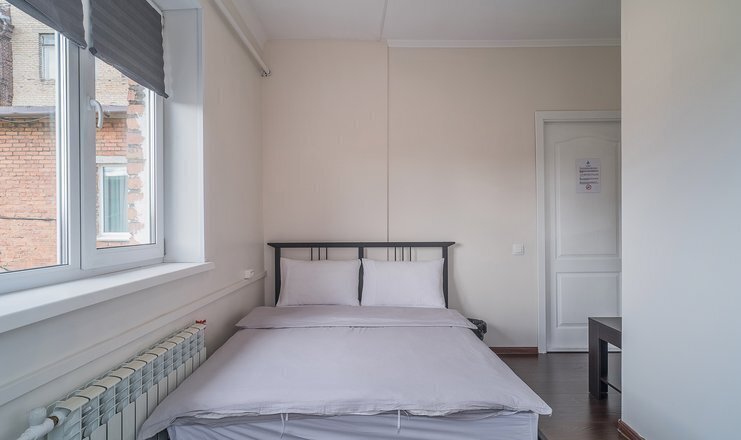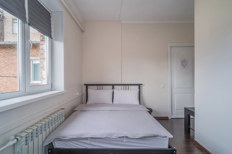 двуспальная кровать, столик. Общая ванная комната на этаже: душ, с/у. Общая кухня с бытовыми приборами, посудой и обеденной зоной