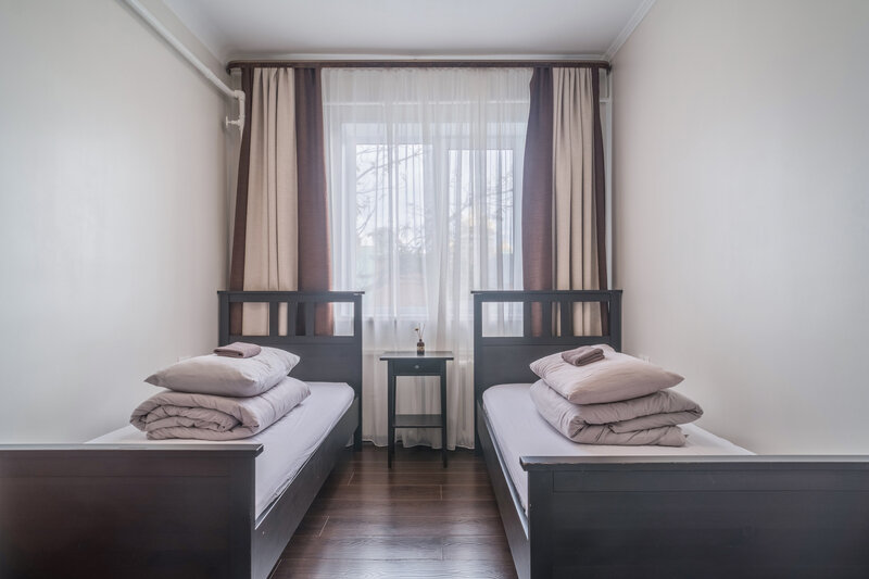 две односпальные кровати, столик, телевизор. Общая ванная комната на этаже: душ, с/у. Общая кухня с бытовыми приборами, посудой и обеденной зоной